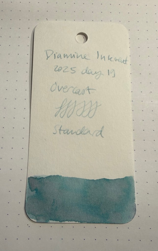 Day 19’s ink is Diamine Overcast, a light celadon blue with pink hints. It’s a standard ink with some nice shading but it’s very, very light.