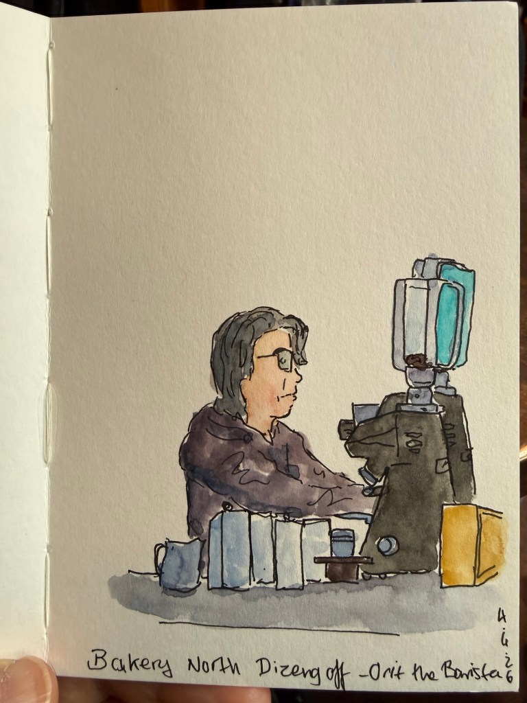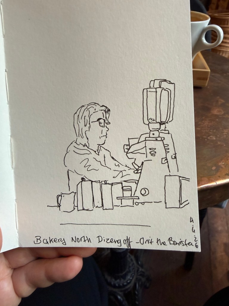 Apart from that I managed to get four short runs in this week (my runs are now laps around the bomb shelter) and I went to my favourite cafe and sketched my favourite barista at work: