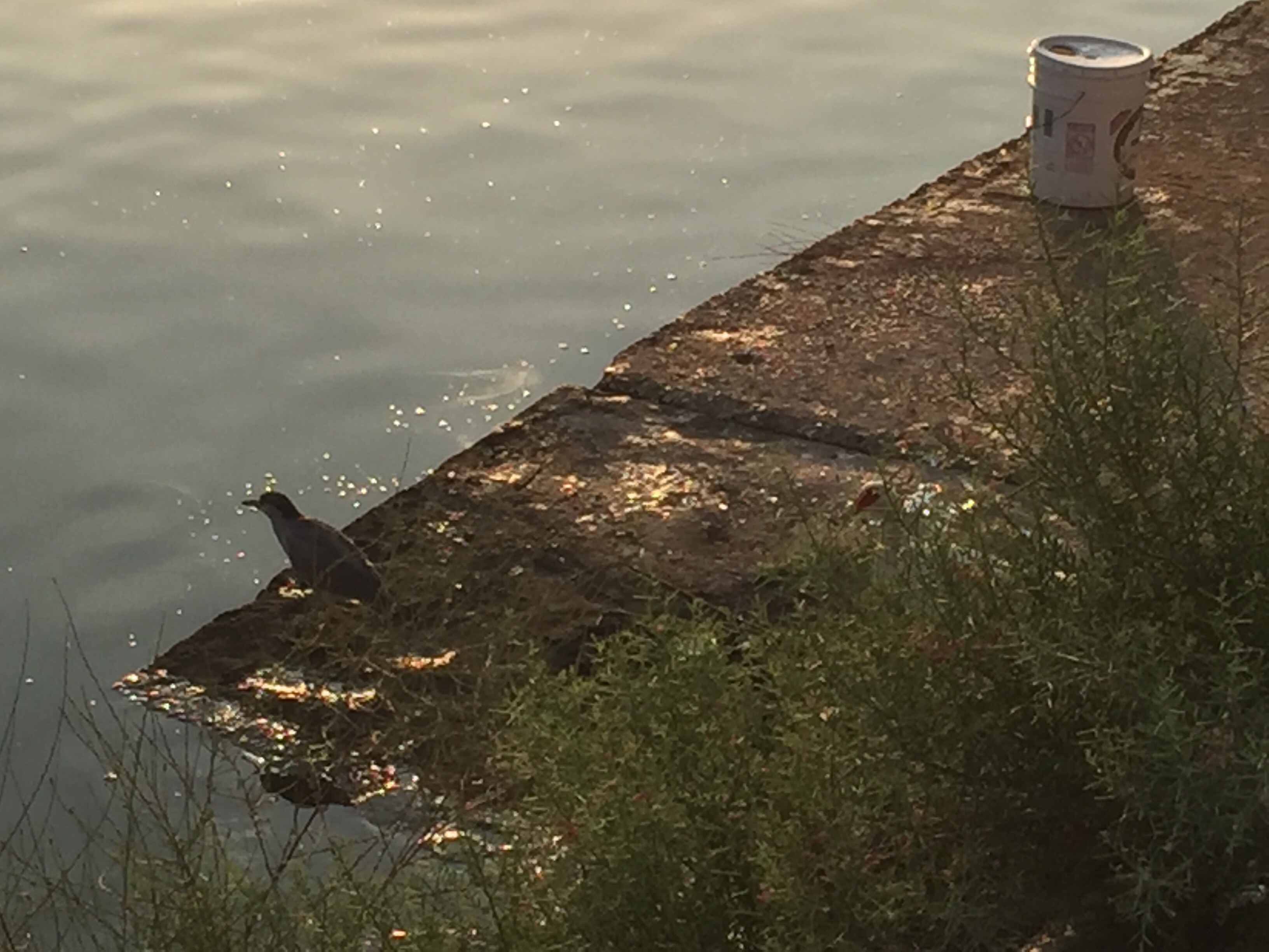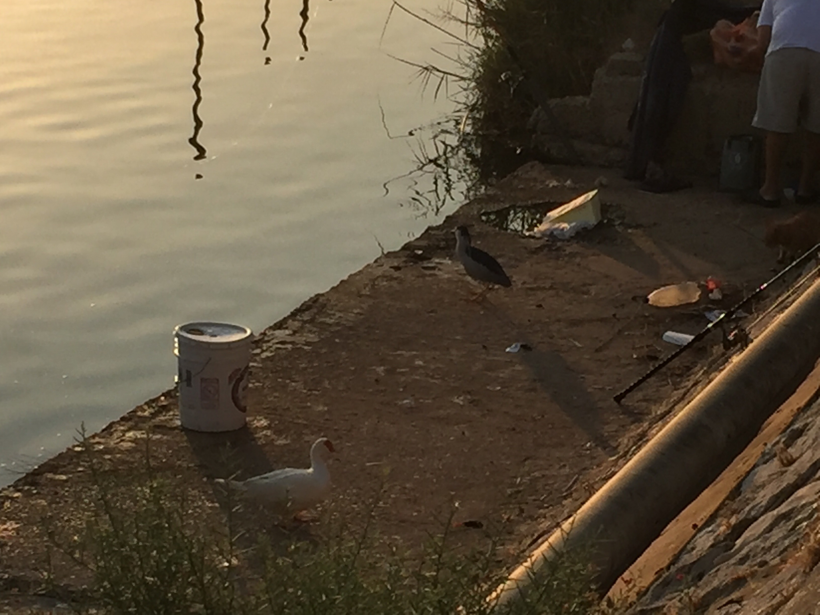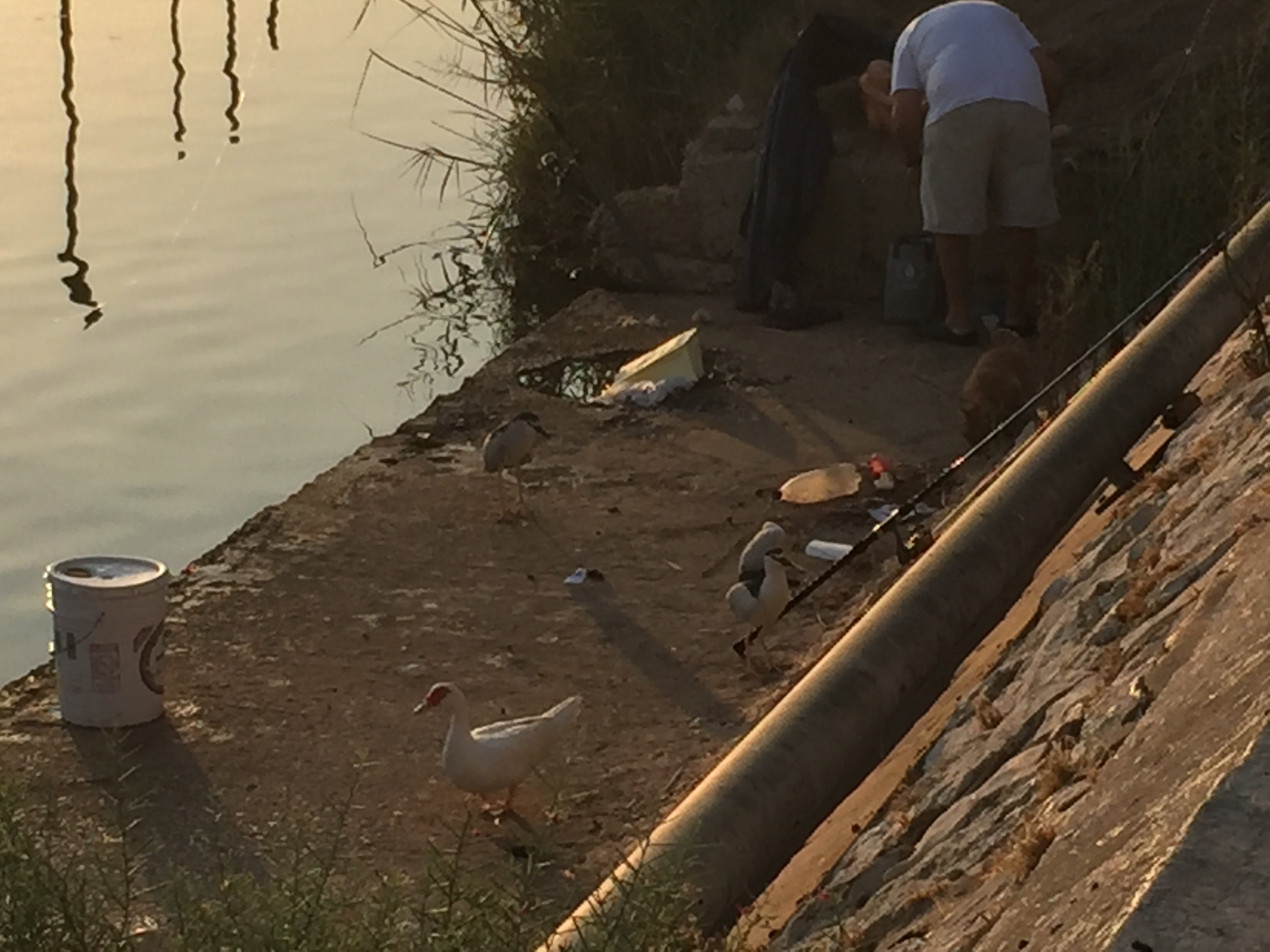 A man fed a group of stray cats and night herons before sitting down to fish. The cats had the good sense to keep a wary distance from these well-armed birds.