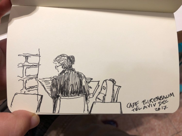 Quick sketch after breakfast at Birenbaum cafe in Tel Aviv. Brush pen on Moleskine pocket sketchbook.