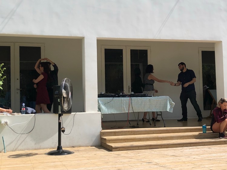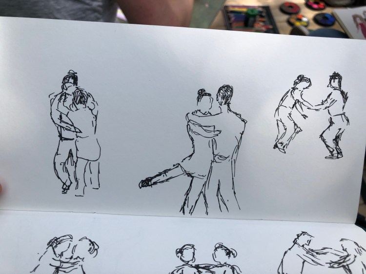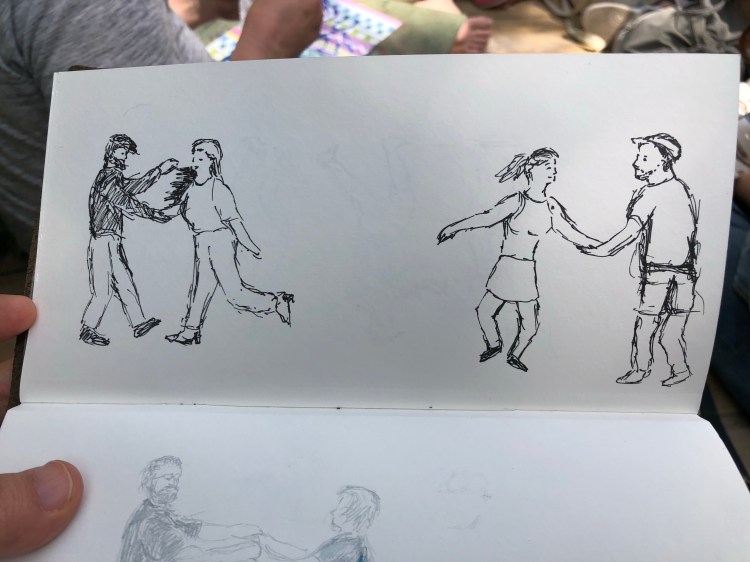 Urban Sketchers Tel Aviv met up outside Beit Chana, a local community centre, for a special Swing and Draw event. Around 20 dancers danced to Swing music out of old records played on two turntables while around 30 of us Urban Sketchers drew them. It was a lovely event and I thoroughly enjoyed myself (I managed to reach my one week 100 people challenge goal during the two and a half hours I was there). I had to leave early due to family obligations but I was so glad that I participated anyway.