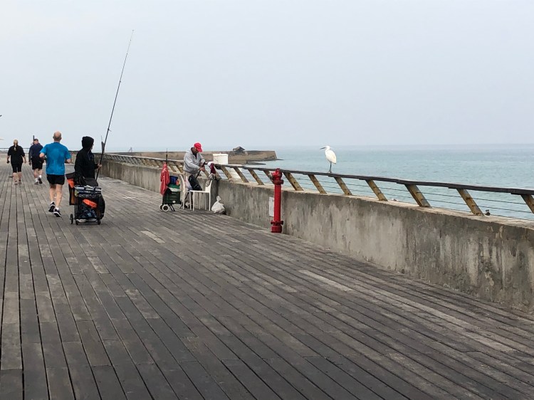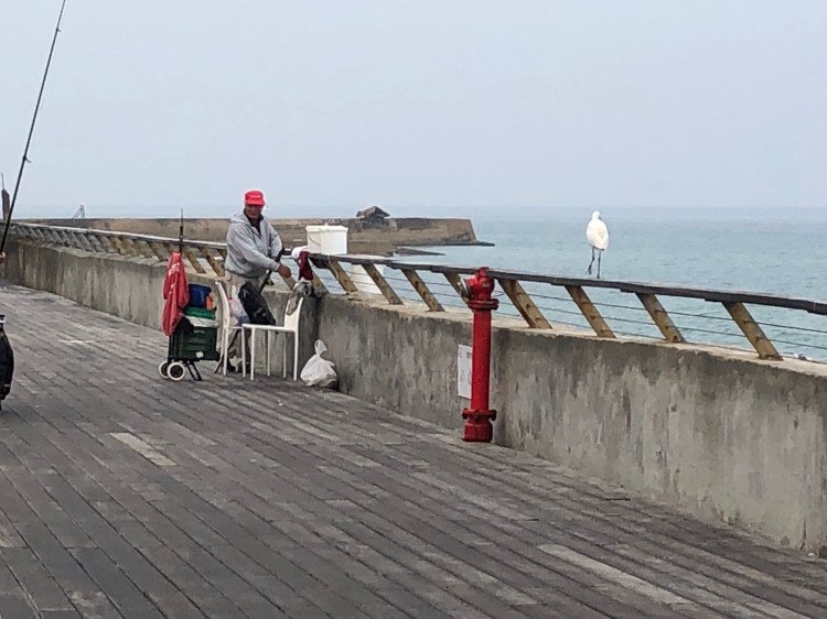 There’s a smart little egret (Egretta garzetta) who likes to stalk talentless fishermen and beg for the small fry that they catch, and if I run early enough in the morning I get to see it in action