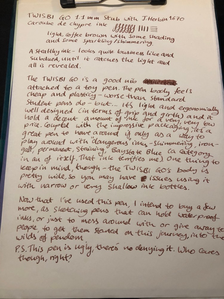 Here’s a writing sample with a TWSBI GO 1.1 stub, which I did late at night when I was pretty tired, and so I spelled TWSBI phonetically, so whoopsie.