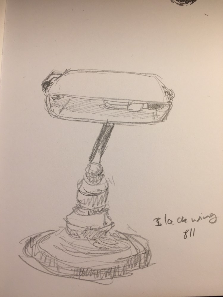 Here’s a sketch of my banker’s lamp (which is a bit wonky after my cat dropped a giant pile of books on it) done with the Blackwing 211. I’d say it’s a B or a 2B, depending on the maker, but in no way is it a pencil that I’d call “firm”. It’s great for quick sketches, but I wouldn’t recommend it for under-drawings.