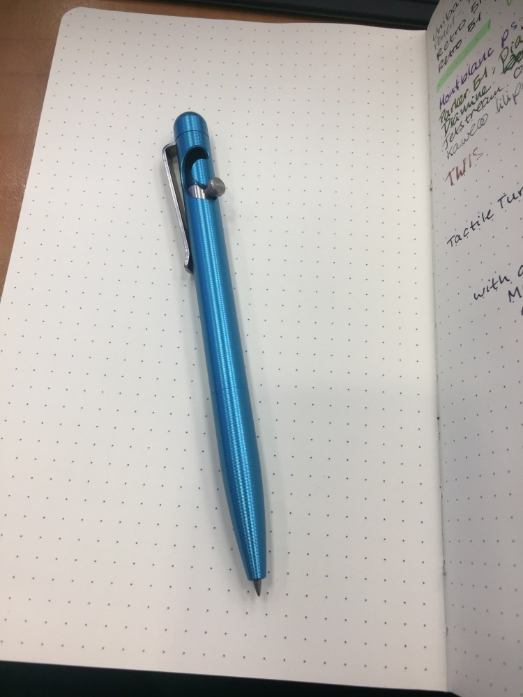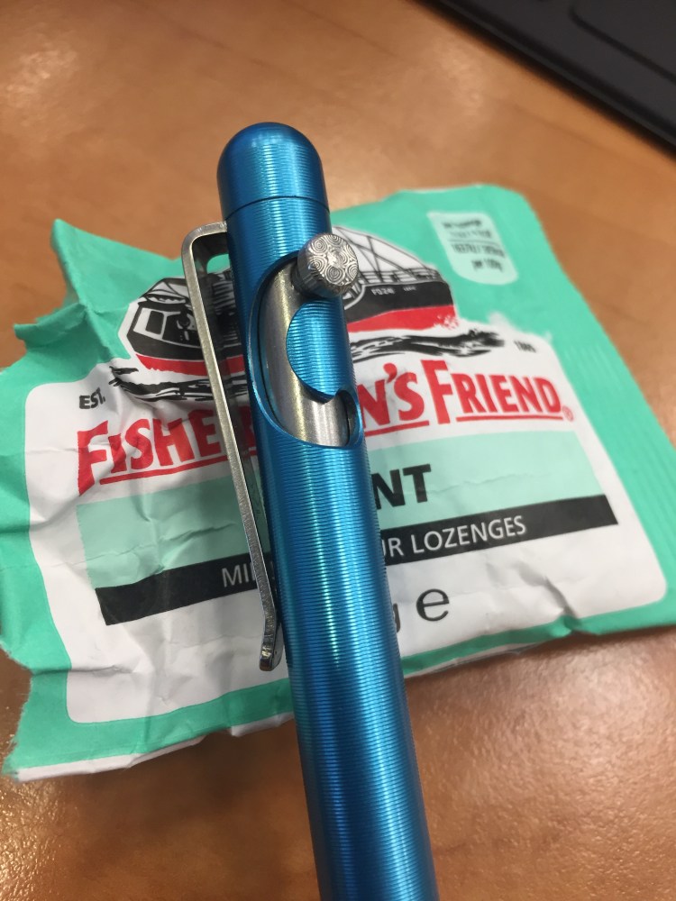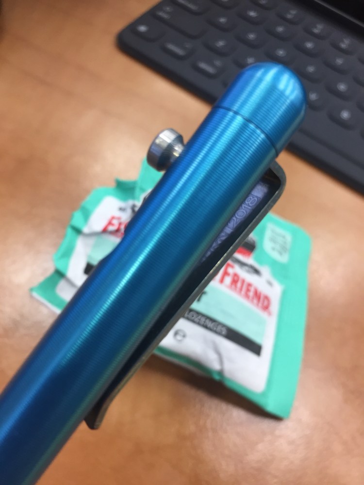 The only logo on the pen is very cleverly hidden beneath the formidable clip. The clip, the pen and the anodization have endured well so far after months of daily use. It is worth noting though that this pen doesn’t bash around in my bag like my Big Idea Design pens do.