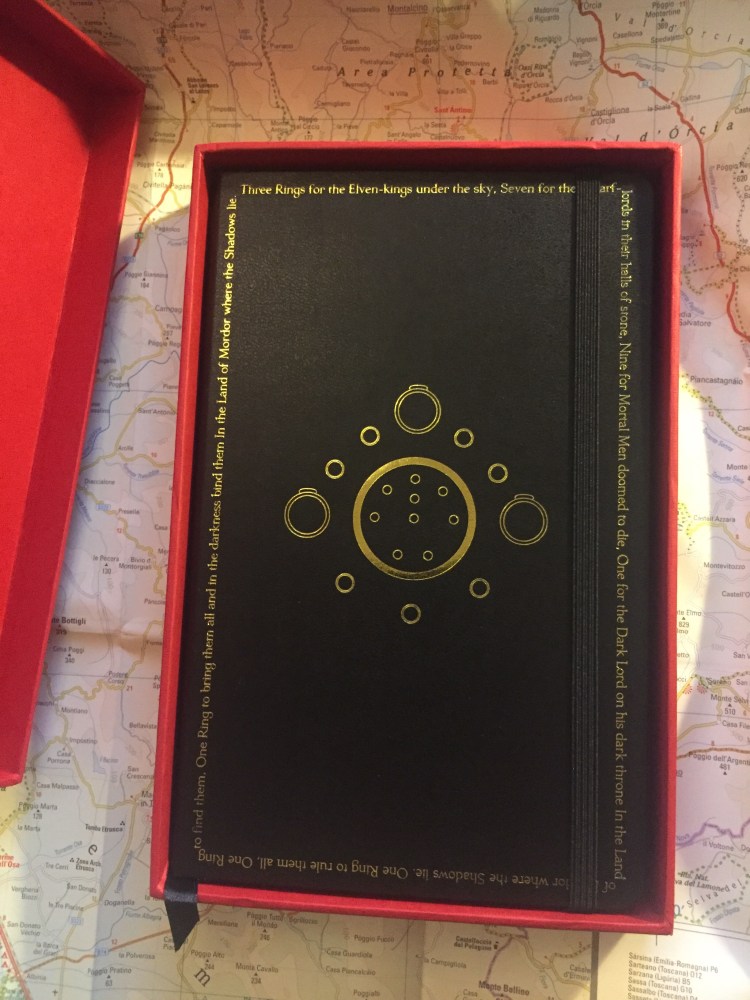 Now comes the notebook, the main event. It’s a large ruled Molkesine, with the famous “One ring to rule them all” poem embossed in gold all around the margins, and Tolkien’s illustration of all the rings embossed in gold in the centre.