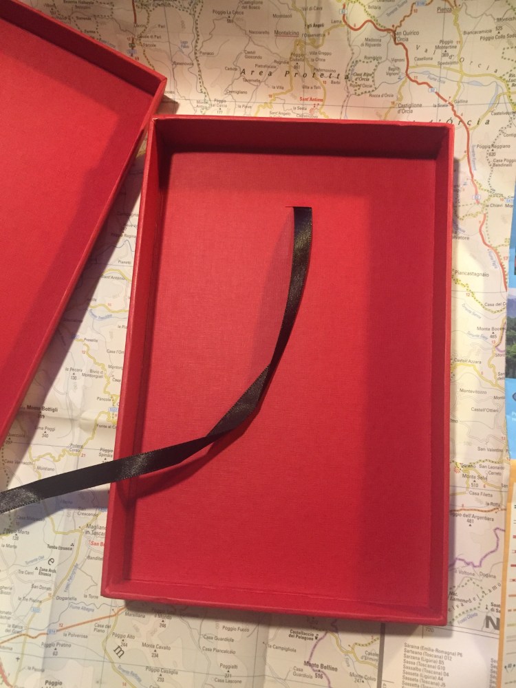 The box itself is a well made cardboard box that can be used to store the notebook, or appropriated to store pens, pencils, pocket notebooks, etc. There’s a black satin ribbon attached so that you can easily pull the notebook out. Very elegant.