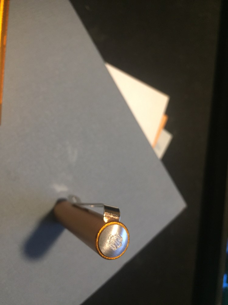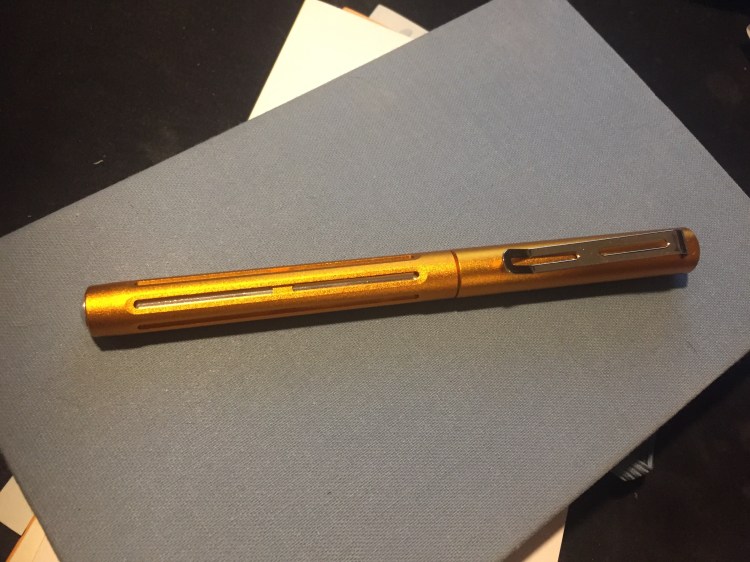First comes the colour, because there’s just absolutely no way to ignore it. It’s nothing like I would have expected orange pen to be: it’s like an amalgamation of gold and bronze with a dash of copper. This is a rich and SHINY finish that sparkles and glows. You cannot ignore it, the very opposite of subtle, and yet it isn’t gaudy and doesn’t look cheap. Orange isn’t a colour that I’m overly fond of, but I’m glad that I picked it out for this pen: it’s perfect.