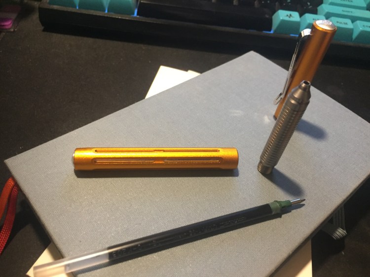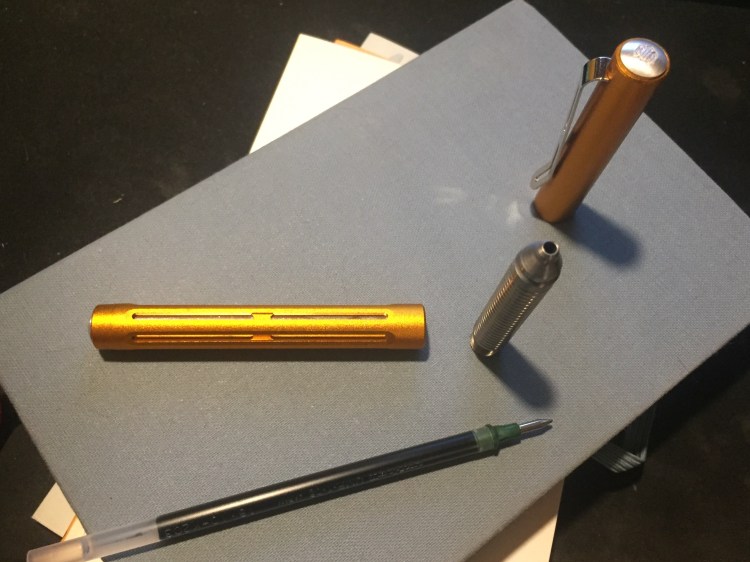 The second thing you notice about this pen is the weight. It’s super light, though it appears to be a solid and heavy looking pen. It shouldn’t have surprised me, as it’s made of aluminum, but the Spoke Pen still looks like it a heavy pen because there appears to be so much metal in use in it that it seems impossible for it to be so light. The first time I picked it up it really surprised me. It’s lighter than my beloved Ti Arto, even though it looks like it should be heavier. At first I had to consciously remind myself to use the Spoke Pen and not the Ti Arto when journaling, but now it’s become the pen I turn to for long writing sessions because it fatigues my hands less. Could it replace my Ti Arto as my favourite pen? Time will tell, but it’s entirely possible the way things stand now.