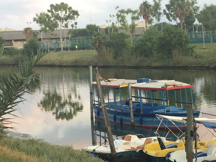 There was a convention of birds on the boat pier in the river: a pied kingfisher and two Egyptian geese were perched pretty close to each other (the kingfisher is the tiny bird on top of the pole in the centre of the photograph).