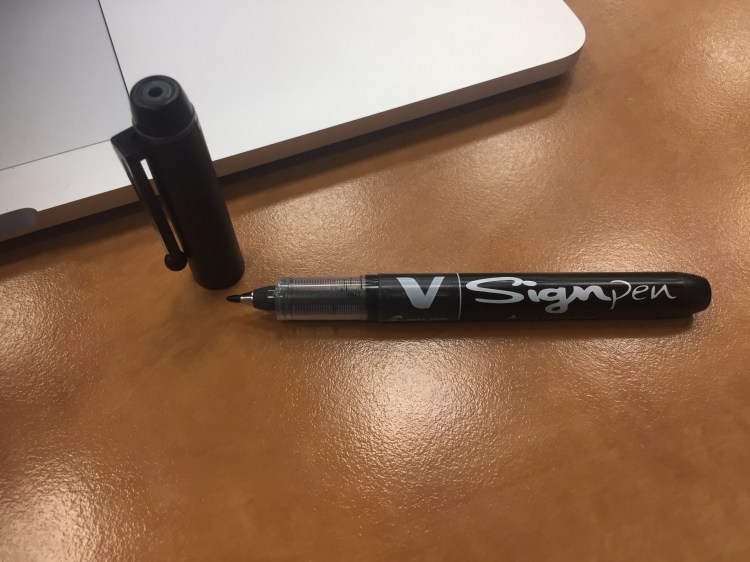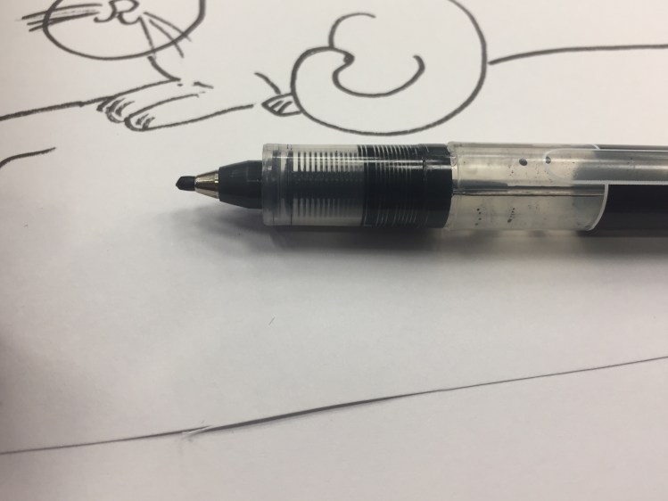 This V Sign works on cheap copier paper with a little bleed through and a lot of show through. It’s non-waterproof, and I’m pretty sure it’s not archival. It is, however, a lot of fun to use. For office doodles of this kind, it’s absolutely perfect; For anything else, I’d recommend something archival and waterproof instead.
