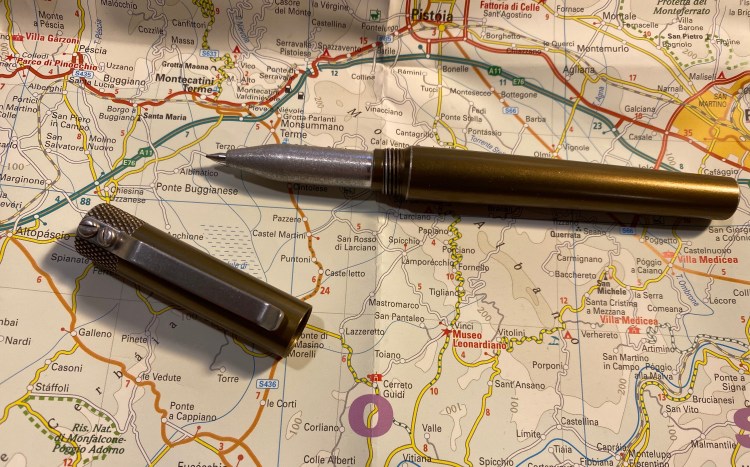 The “Battleworn” finish means that the pen was tumbled after anodization, and so it’s full of nicks and has an “old jeans” kind of look to the top of the cap, the threads, and the tip.