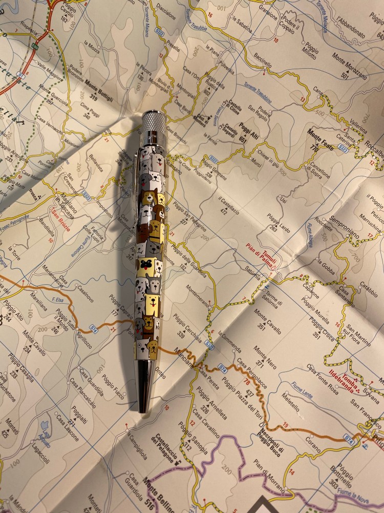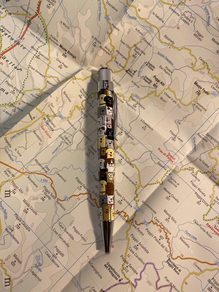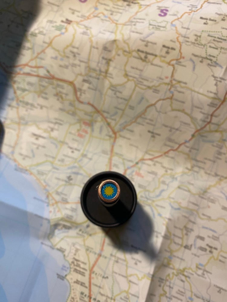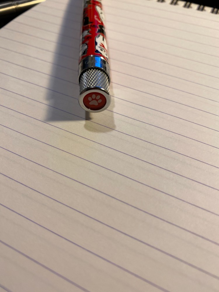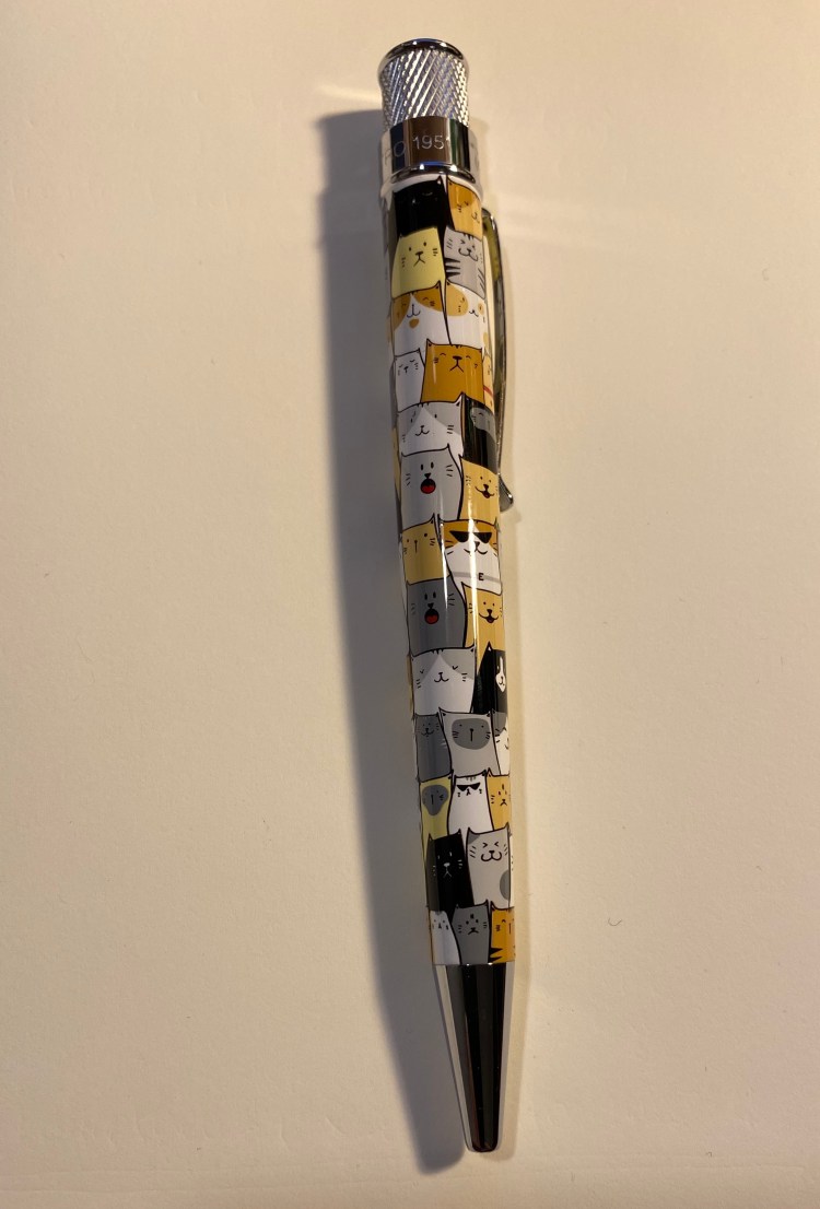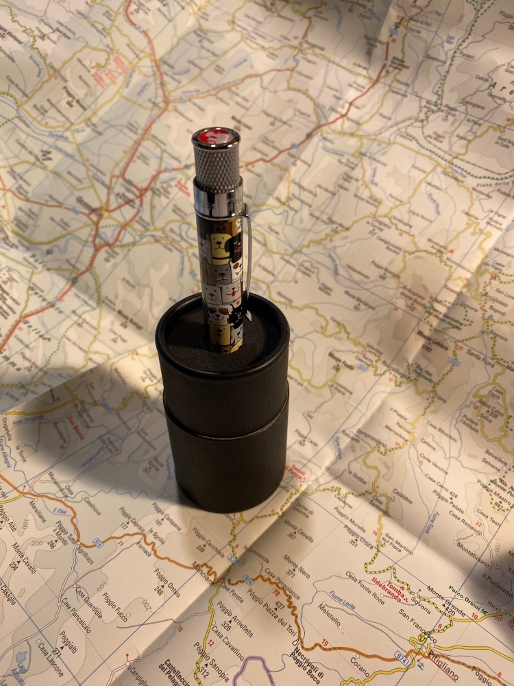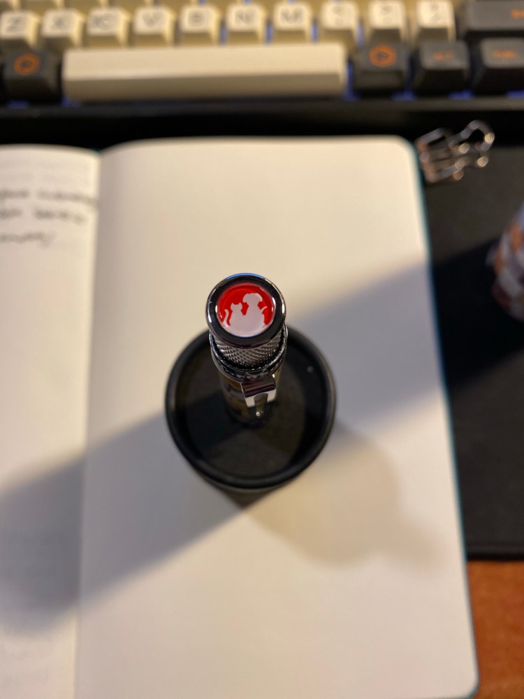 That same logo also appears, in full colour, on the finial/top disk of the pen, and it adds a welcome bit of colour to it.