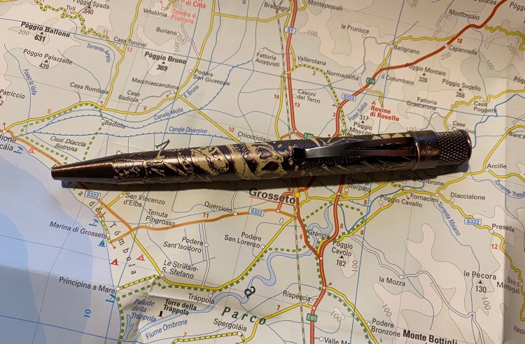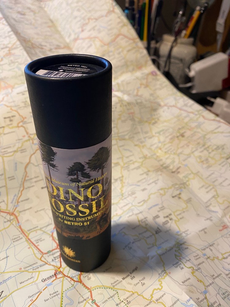 The other thing that surprised me is that the Dino Fossil is numbered. I wasn’t expecting that, and the seller I got it from didn’t mention it, but just in case you care, on the band below the twist mechanism there’s a number, and “Smithsonian” where there usually is “Tornado” etched in. The number also appears on the cardboard tube the pen comes in.