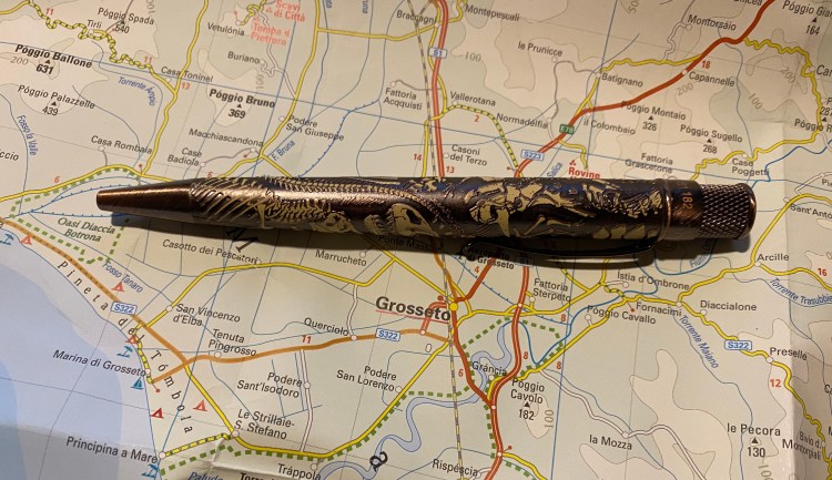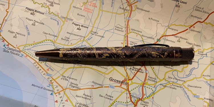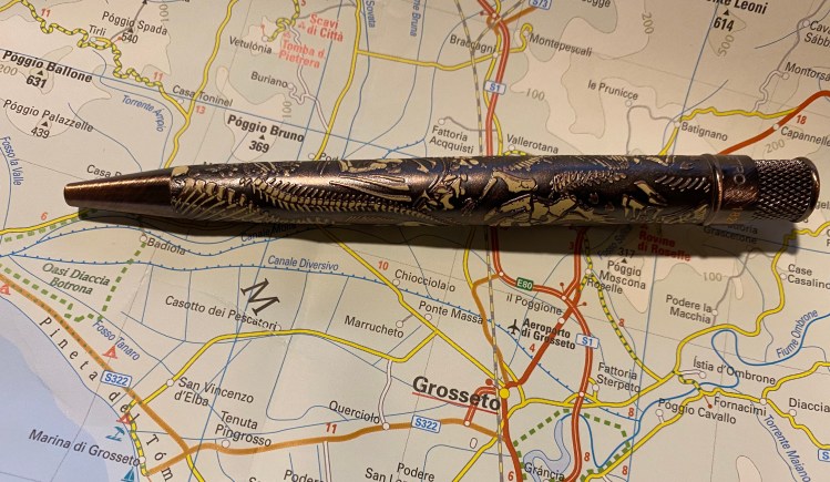 The pen is copper, much like the Retro 51 vintage metalsmith Lincoln, but there’s a lot of added texture to that copper. There’s brushed copper on the pen hardware, a dark matte copper on the pen body, and embossed dinosaur fossils that are partially painted.