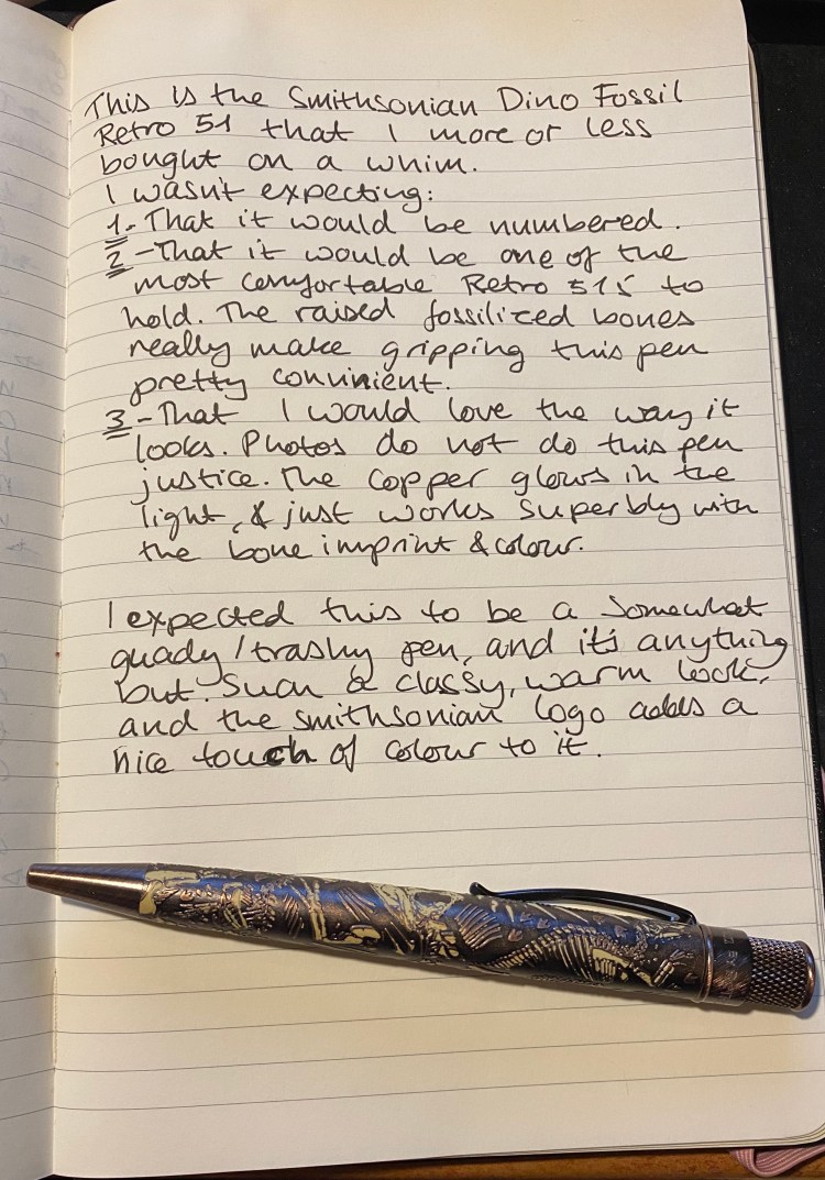 The Retro 51 Dino Fossil was a pleasant surprise: a pen that I thought I bought for gifting, and turns out to be one of my favourite Retro 51s to date. I’m likely going to say goodbye to my Lincoln before this, and I recommend it if you have even the slightest affinity to dinosaurs, natural history, archeology, the Smithsonian or beautiful copper pens.