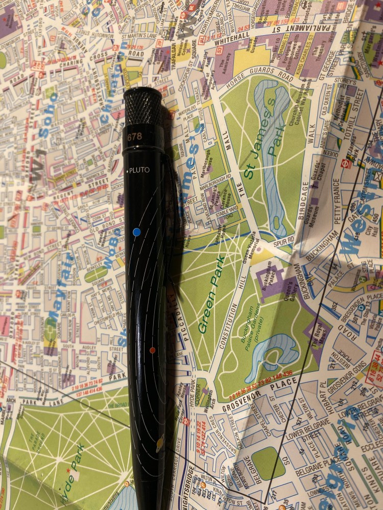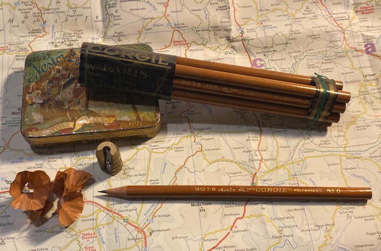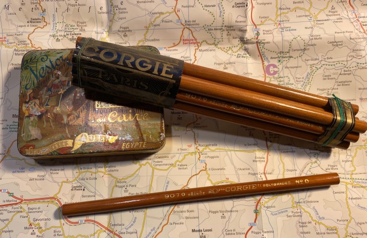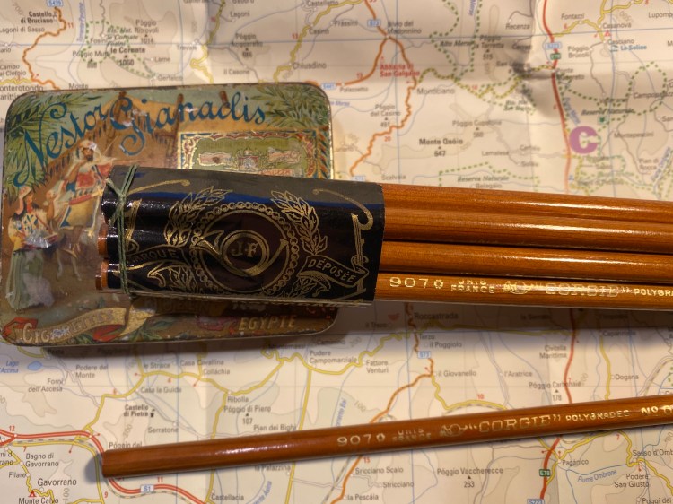So I broke out the “Corgie” (à Paris) 907 pencils, which are natural pencils coated with a thick layer of lacquer that makes them both shiny and satisfying to hold. The French appear to be more restrained in their choice of imprint fonts, but they go all wild when it comes to the wrappers around the pencils. Behold, creativity let loose: