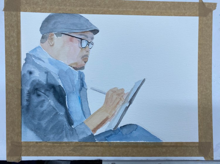 Decided to work on a more conventional piece, and so I drew a watercolour portrait of Urban Sketcher Rob Sketcherman at work.