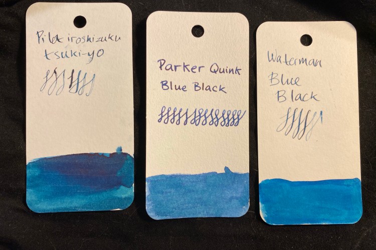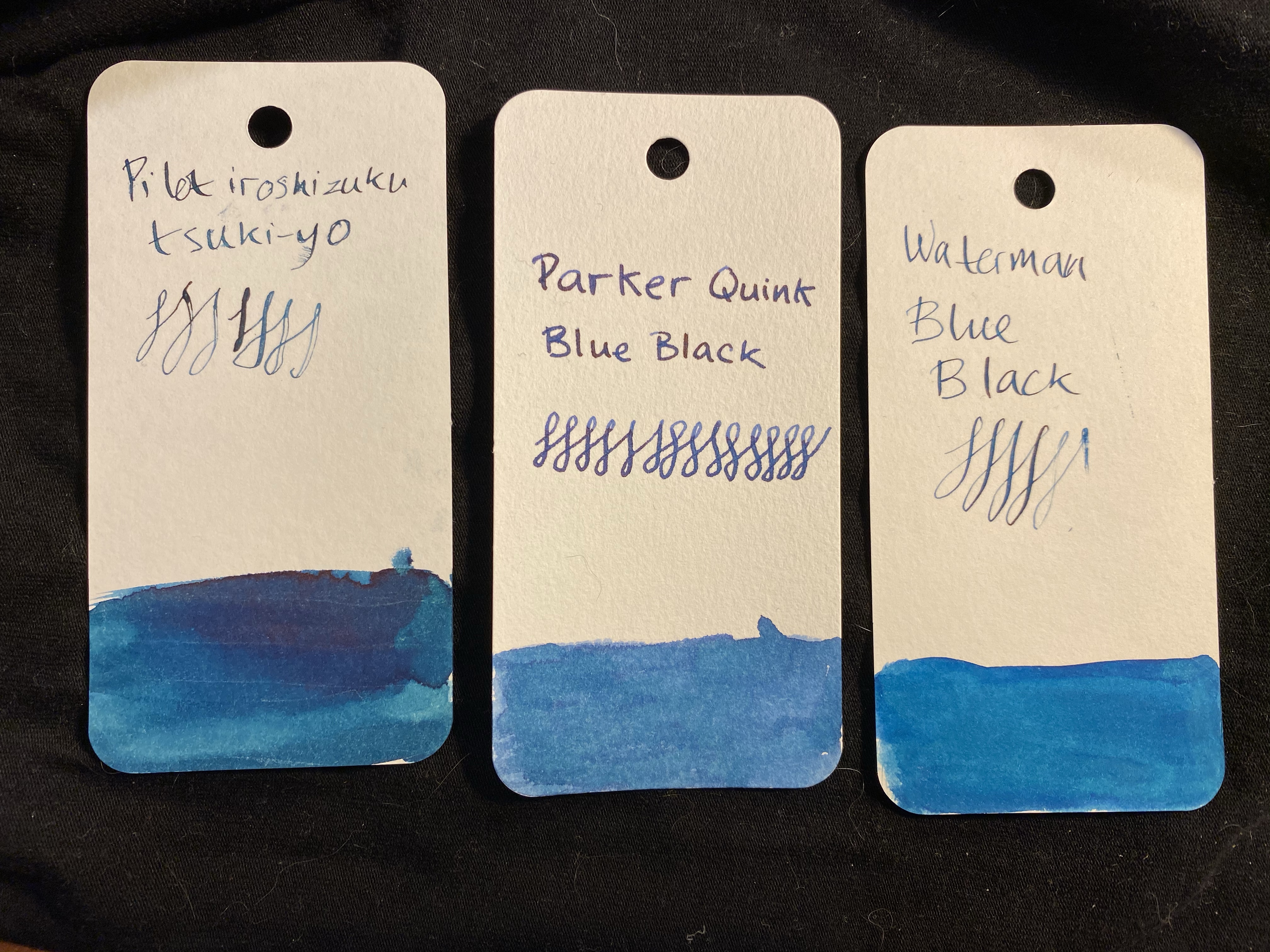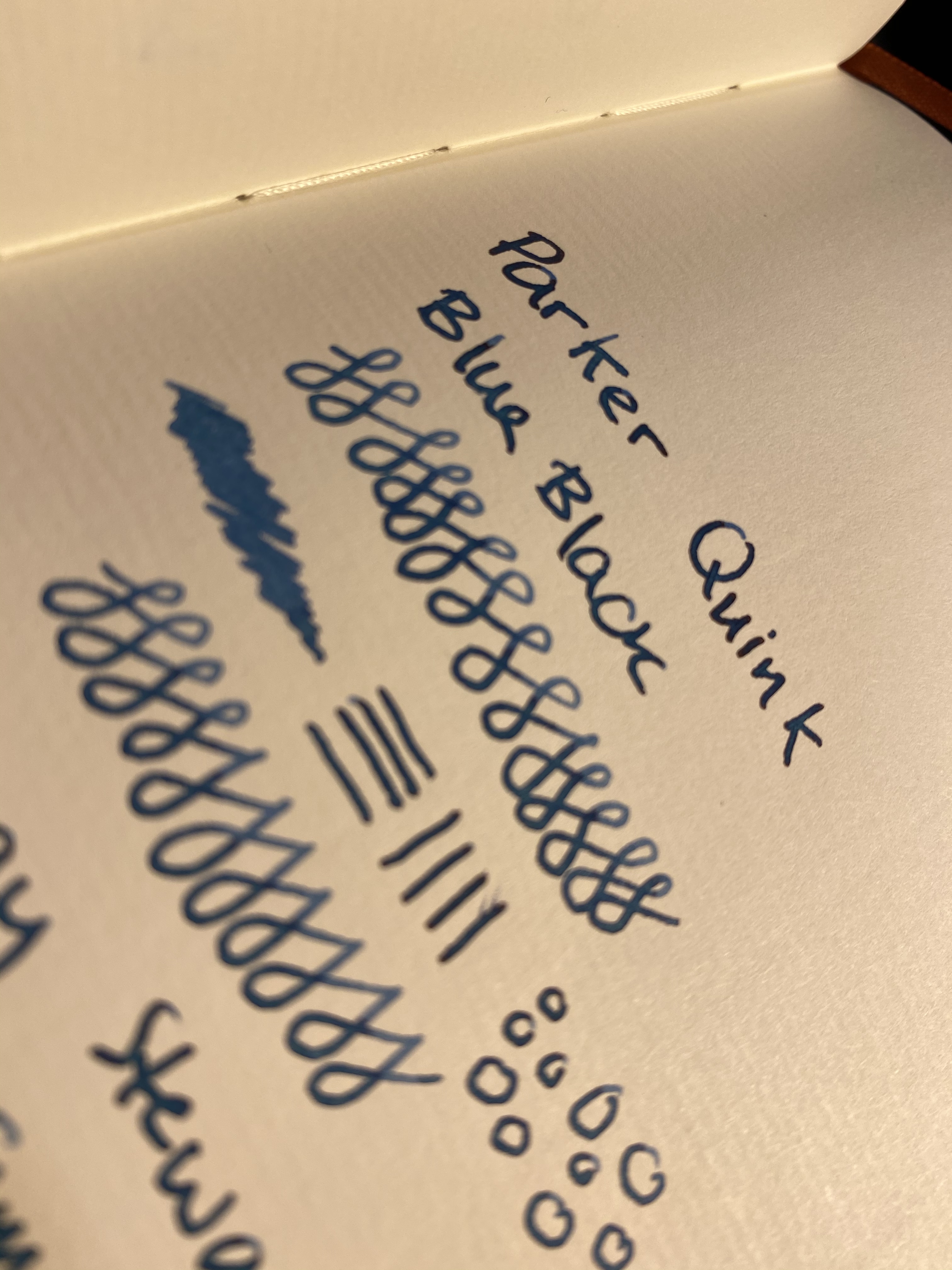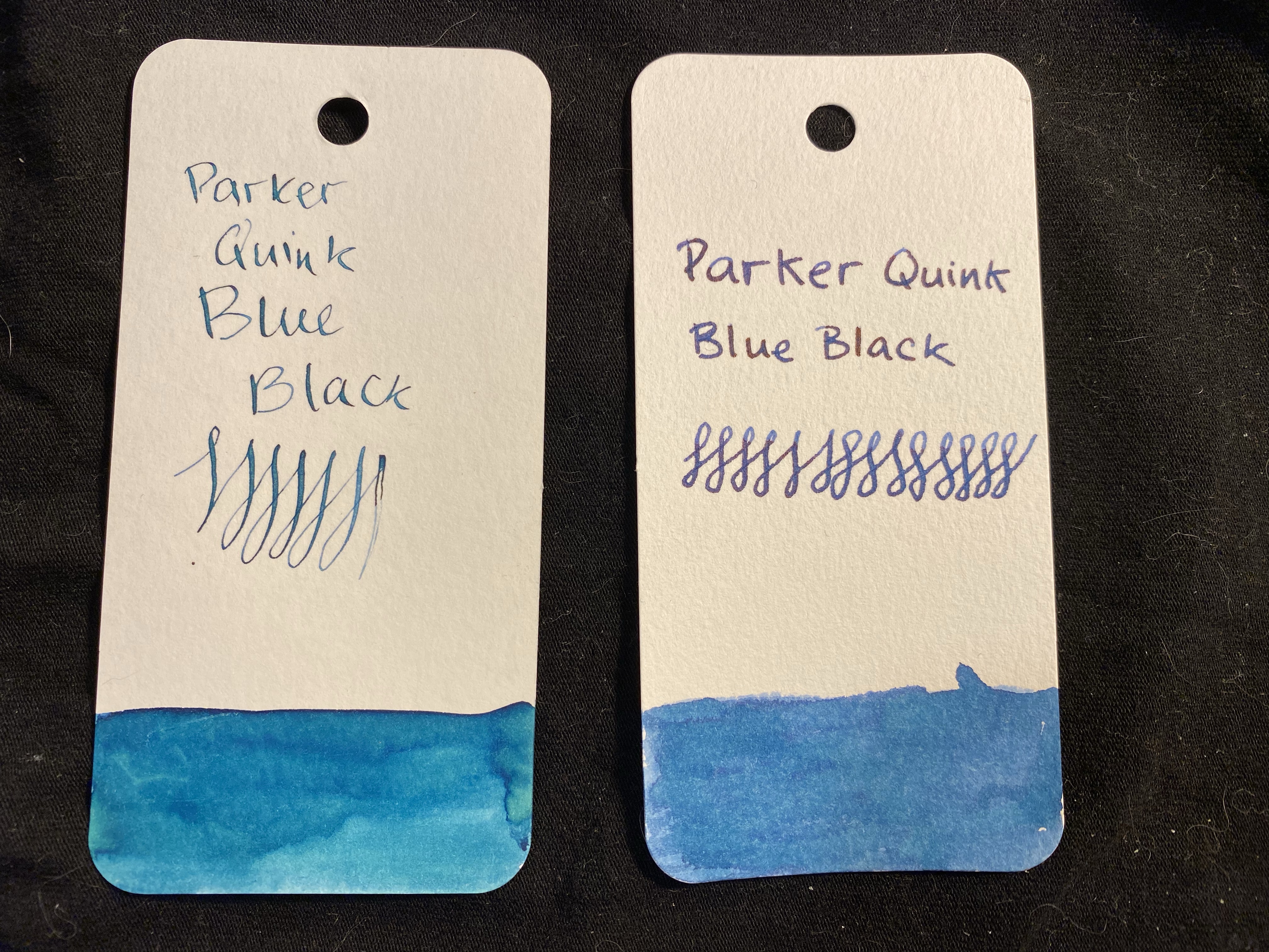 The obvious answer for me is anything Waterman, but specifically Waterman Blue Black, now renamed to “Waterman Mysterious Blue”. But Parker Quink Blue Black is just as readily available, and just as cheaply priced (more or less), and also a workhorse, utilitarian ink that packs a few surprises. So why is it not my go to ink? I’ll get to that near the end, I promise.