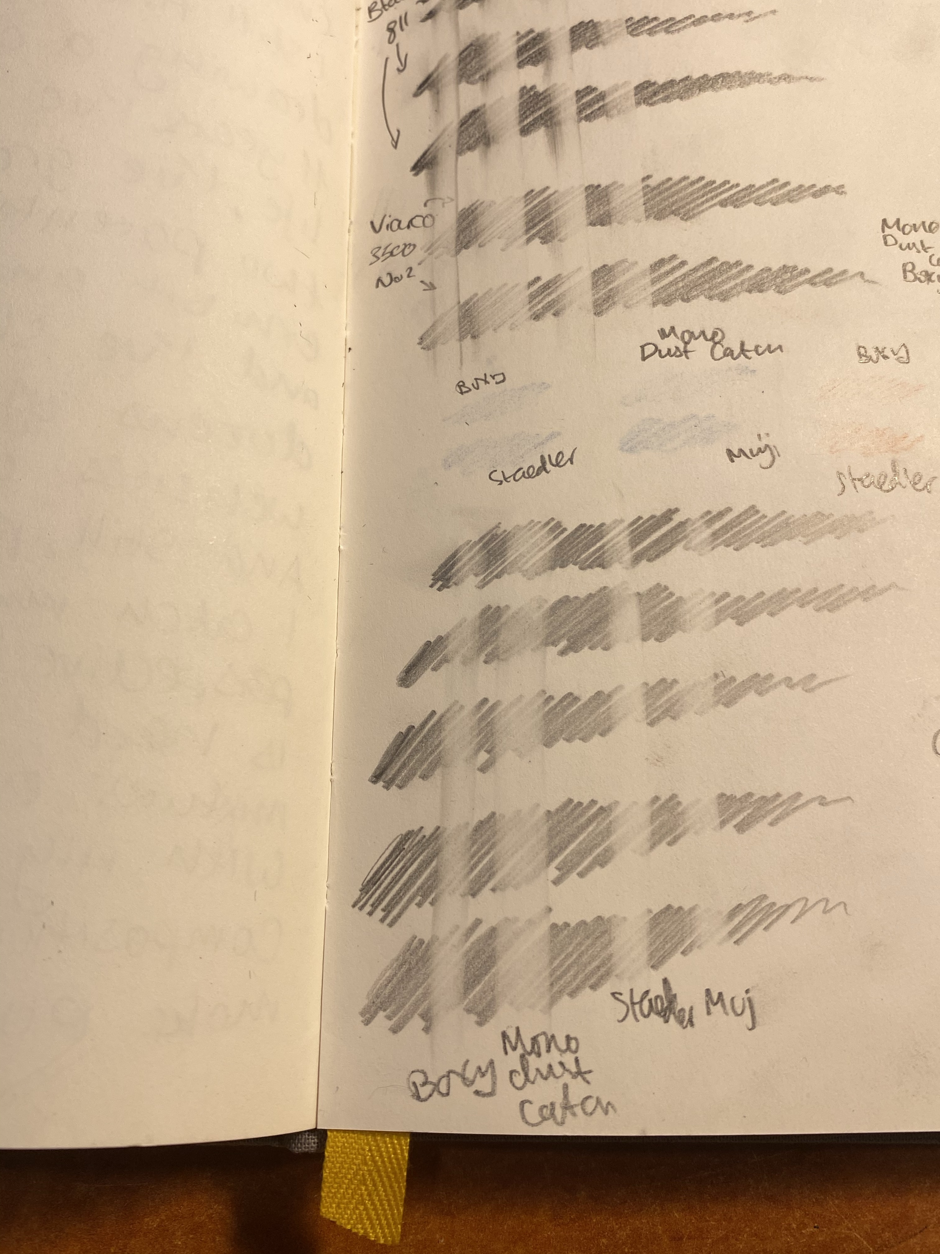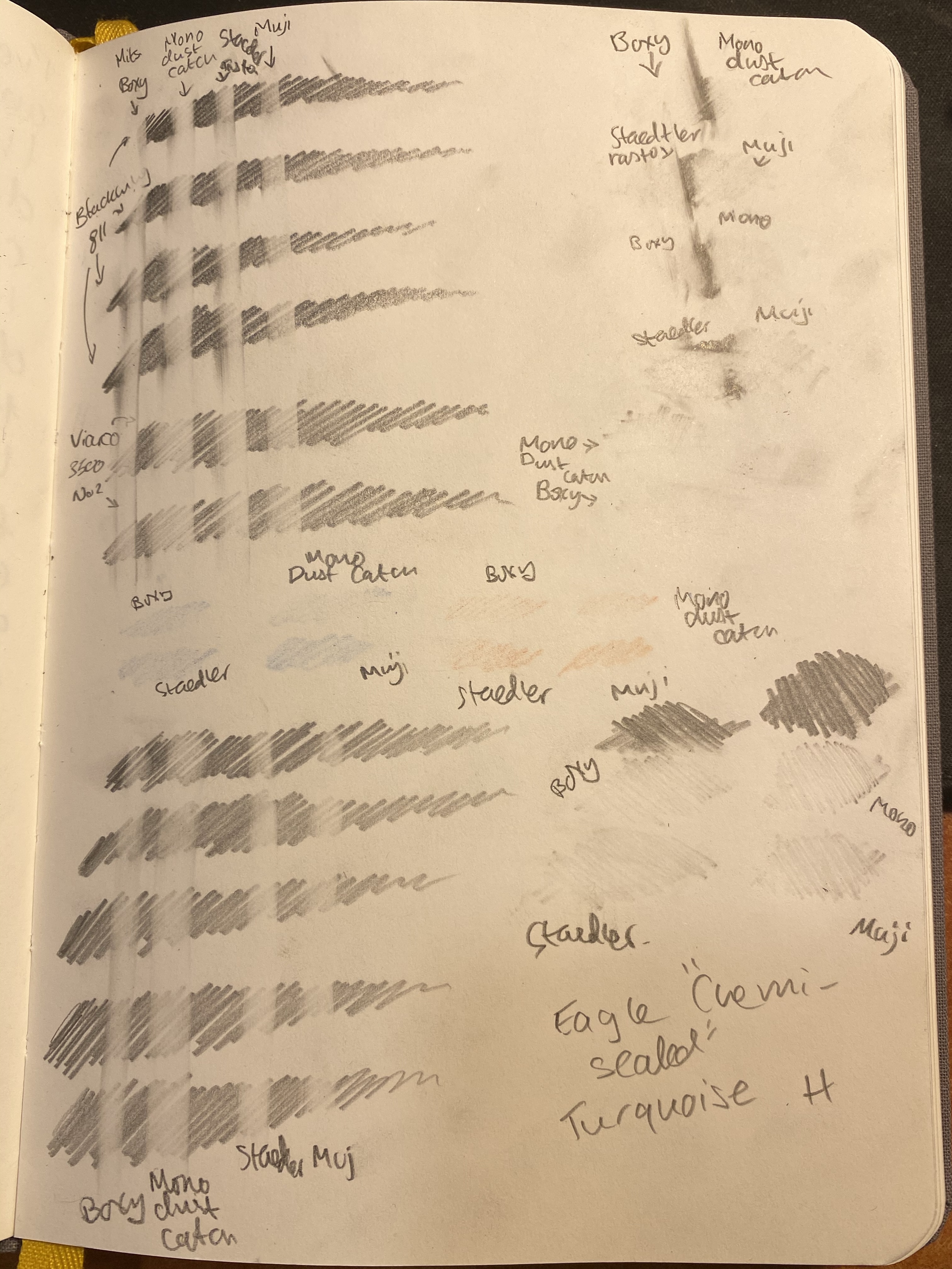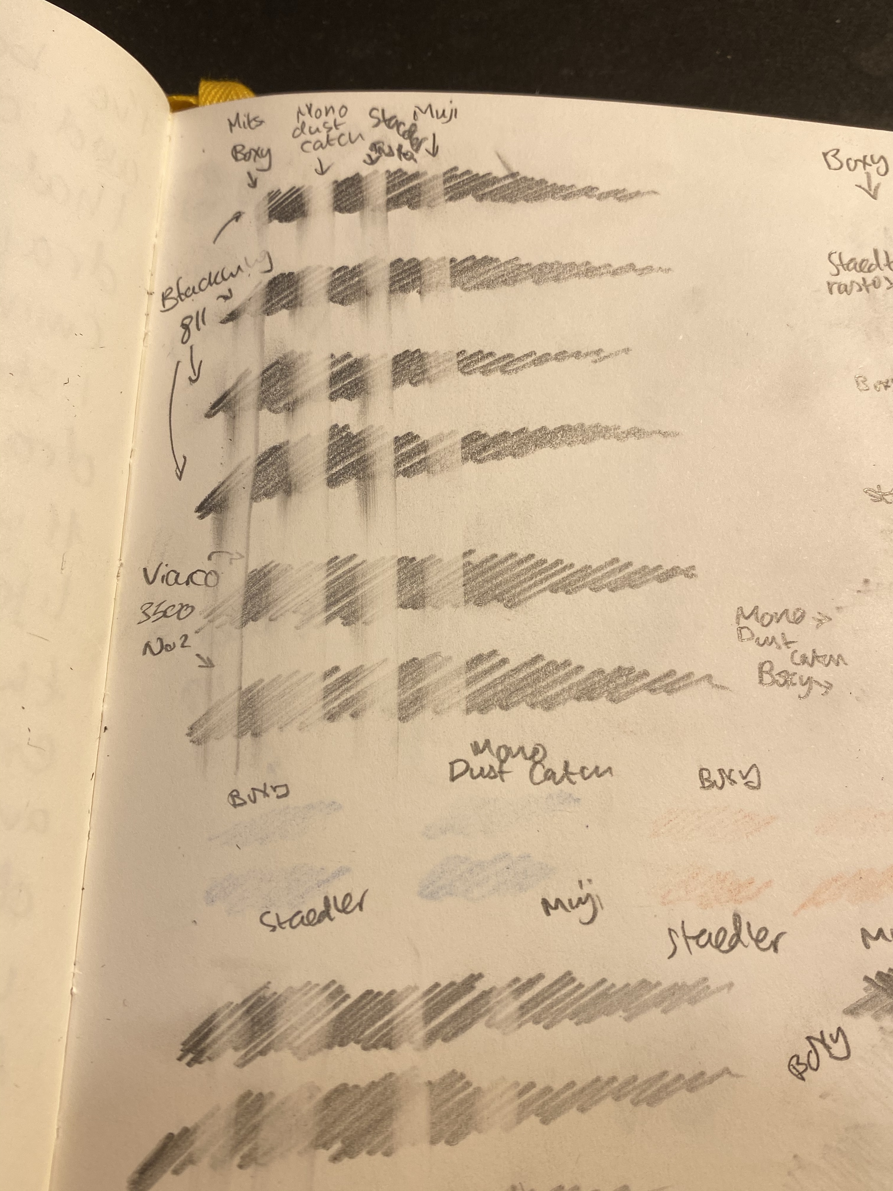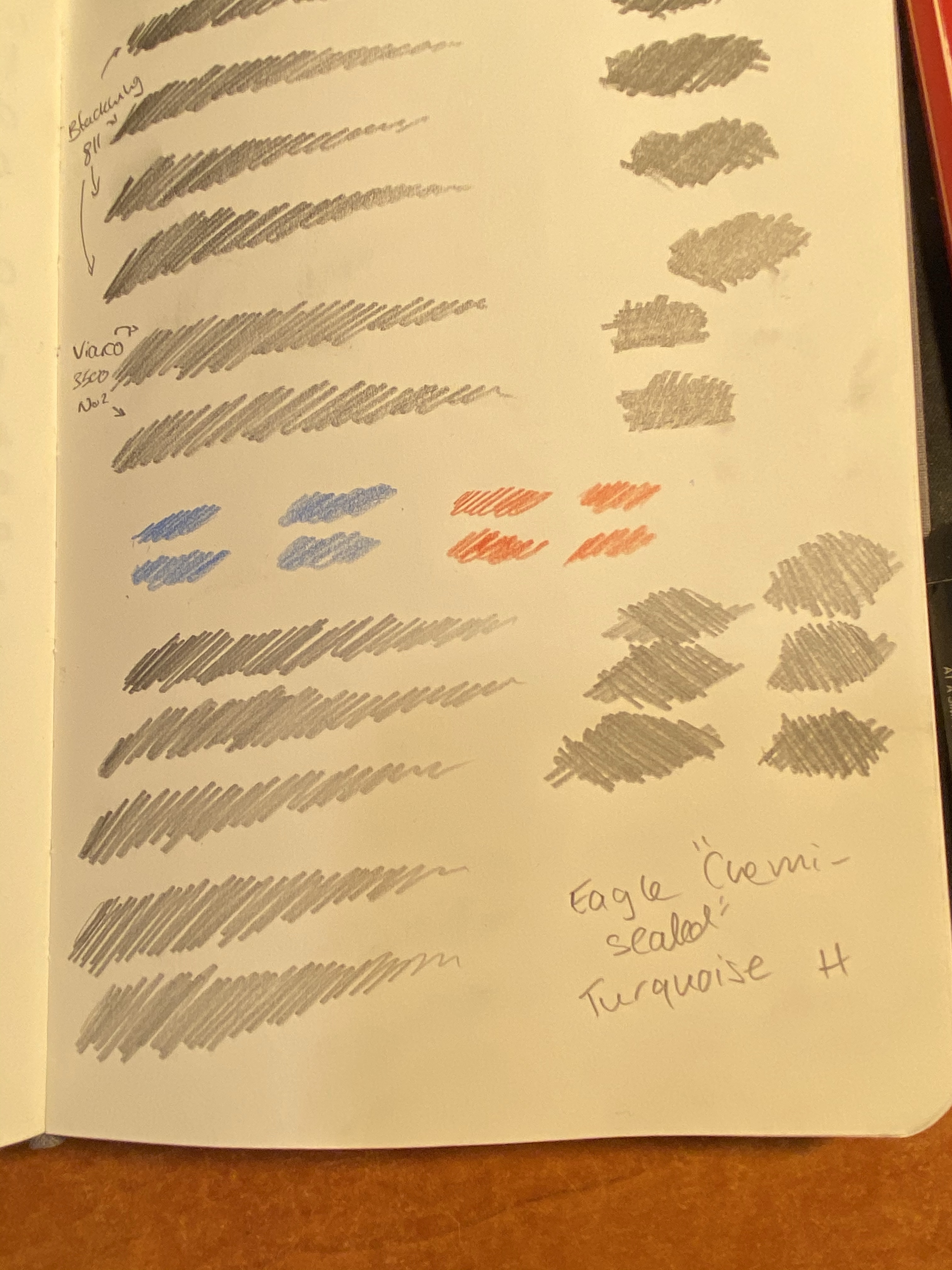 I took out my Baron Fig Confidant, since I do all my pencil tests on it, and scribbled in it in a variety of pencils and even using a Caran d’Ache red blue pencil, though I don’t expect regular erasers to do well with coloured pencils.