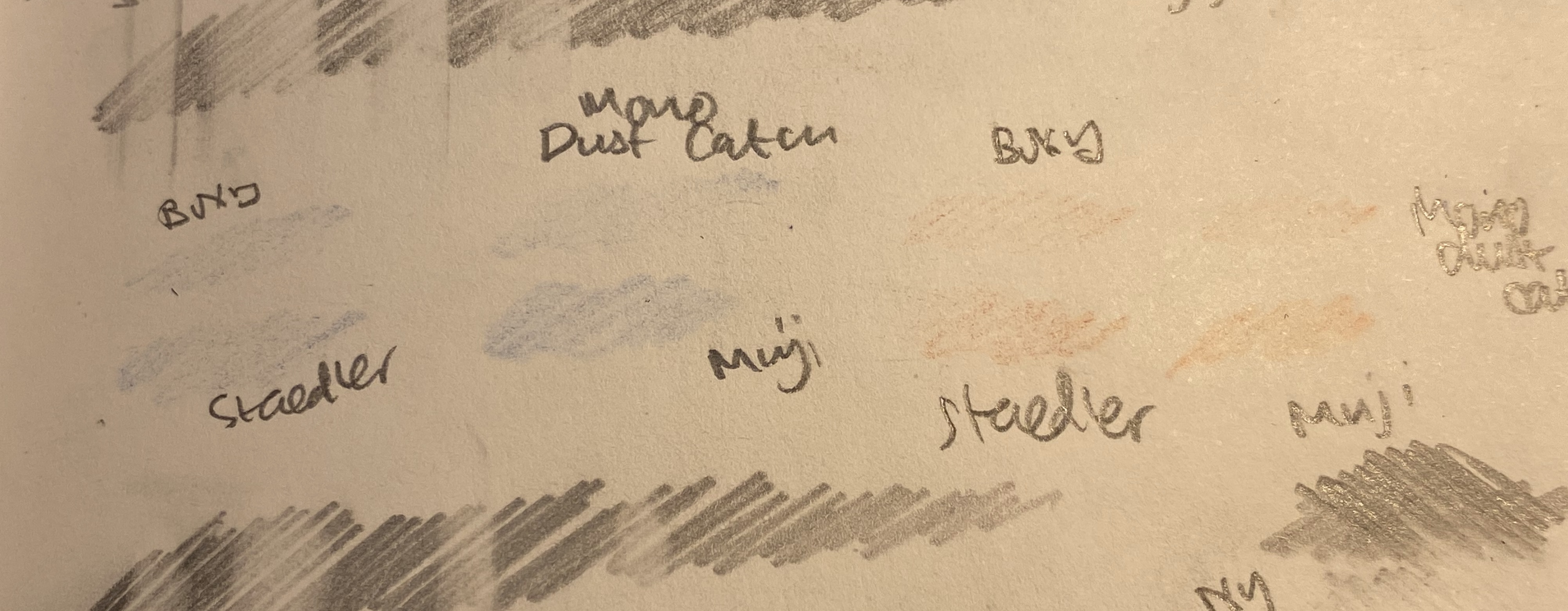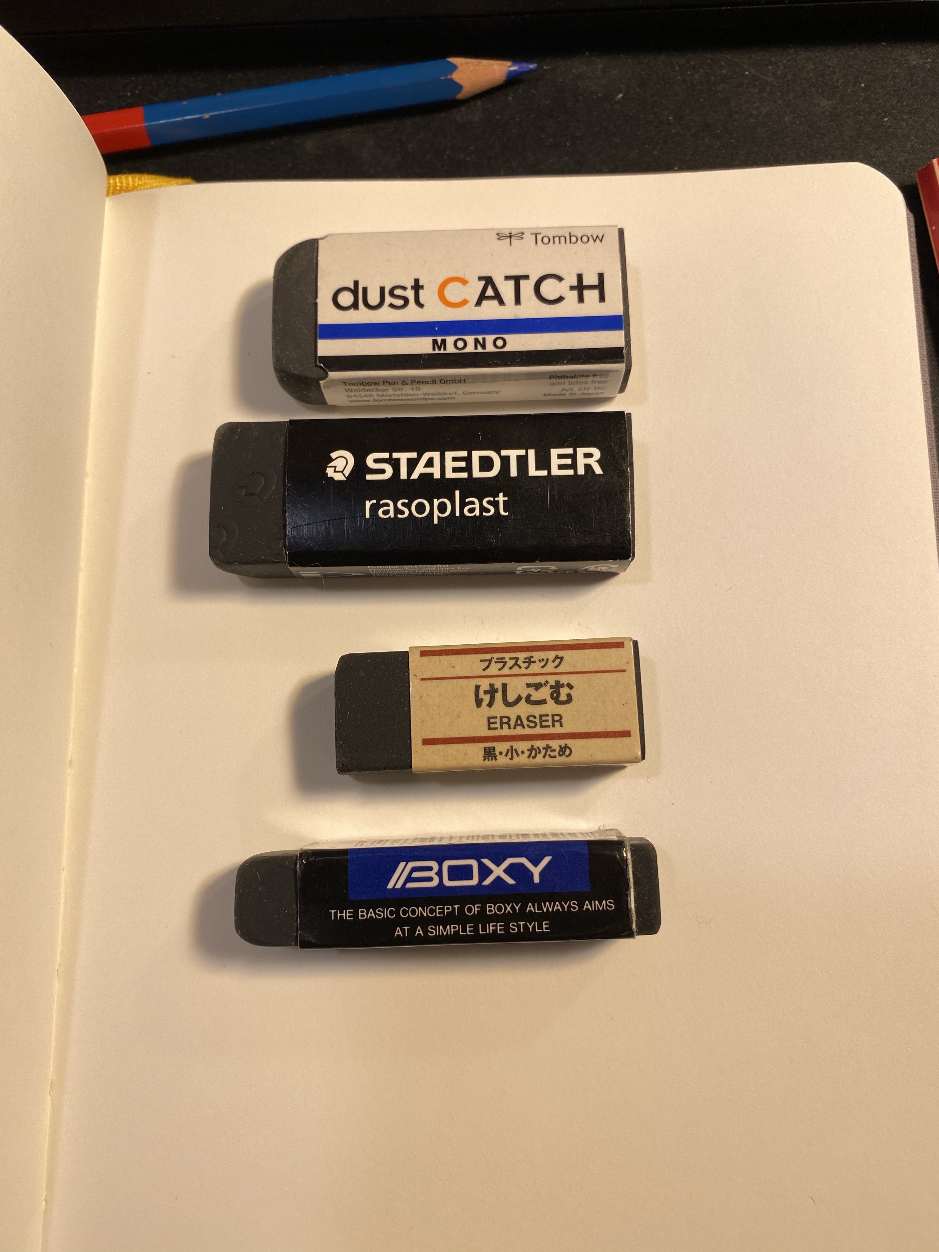 I’d also point out that none of these erasers are what I’d call “best”. They’re good erasers, but even the boxy left graphite ghosts behind. There are better erasers on the market, but these in general behaved better than average (even the Muji), and the Boxy and Dust Catch are pretty good. They held up well even against the Caran d’Ache red/blue pencil, which surprised me.
