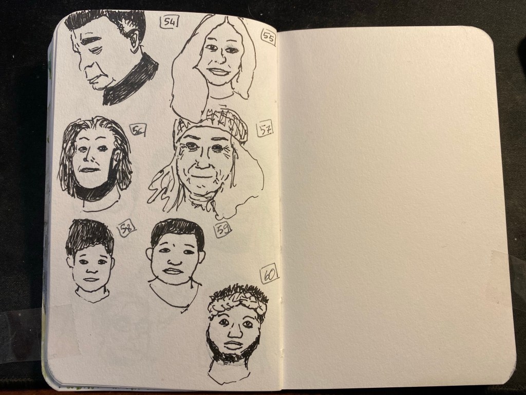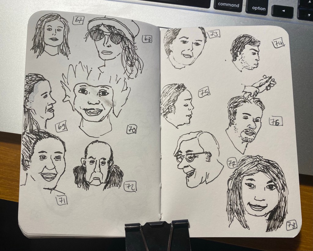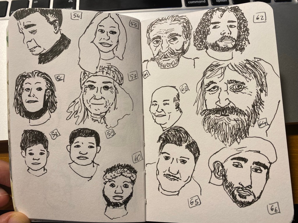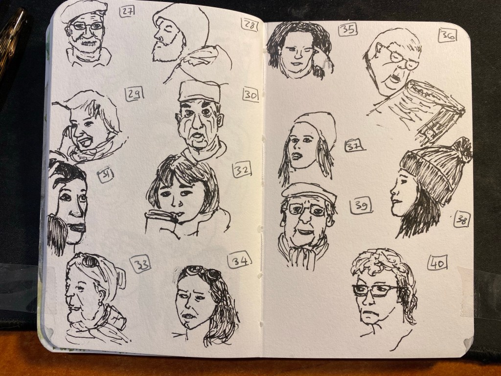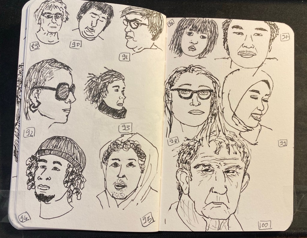 Day three of the One Week 100 People challenge. It appears that the street photographers aren’t exactly catering to sketchers, or they’d take more profile pictures than they currently do 🙂 I’m getting into a pretty good rhythm, and more importantly I’m getting better at figuring out where to start each portrait. Many start with a general outline, others start with the hair, or the nose->eyes->lips. Every day it gets a little easier to draw people, and though 20 people a day is still far from easy, I do feel like I’m getting the most out of this challenge this year because of my choice to work directly in pen and with no shading or paint.