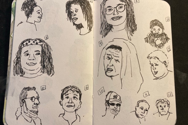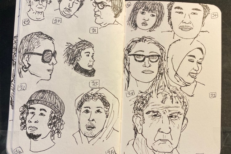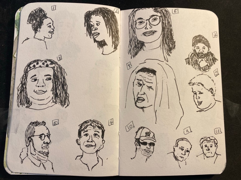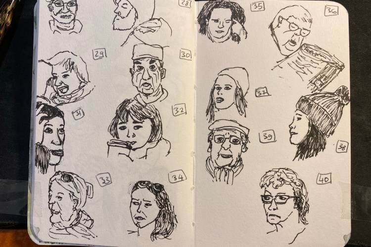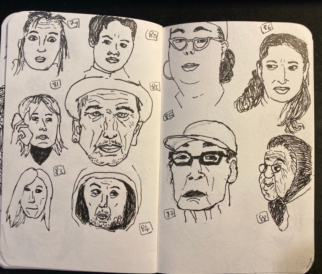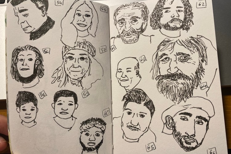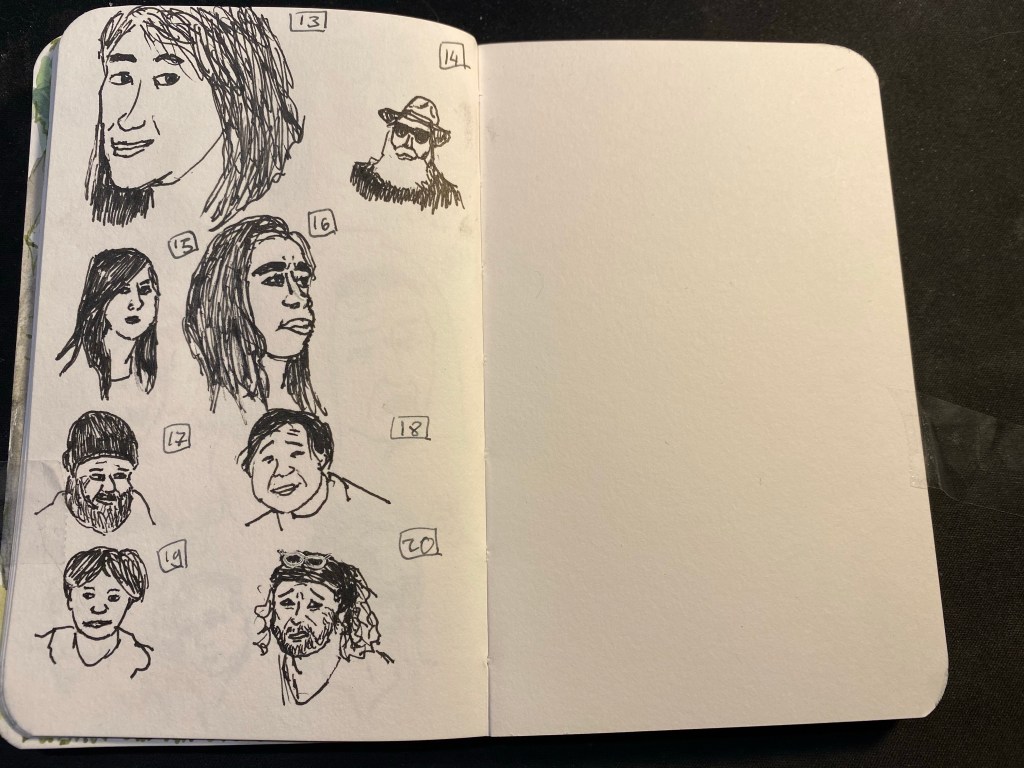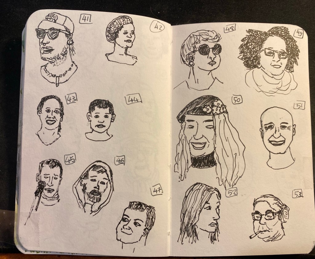 Day three of the One Week 100 People challenge. It appears that the street photographers aren’t exactly catering to sketchers, or they’d take more profile pictures than they currently do 🙂 I’m getting into a pretty good rhythm, and more importantly I’m getting better at figuring out where to start each portrait. Many start with a general outline, others start with the hair, or the nose->eyes->lips. Every day it gets a little easier to draw people, and though 20 people a day is still far from easy, I do feel like I’m getting the most out of this challenge this year because of my choice to work directly in pen and with no shading or paint.