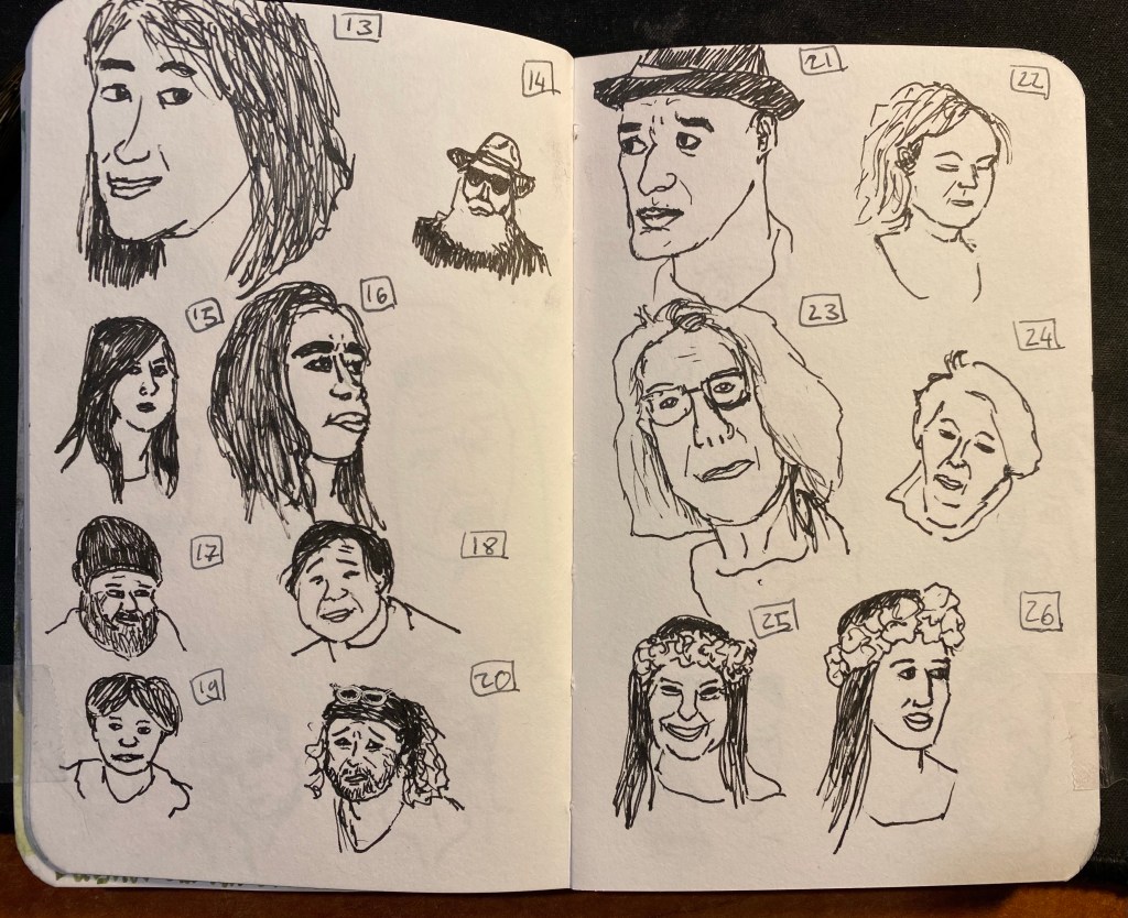 I’m doing the One Week 100 People challenge again this year (I skipped it last year but I have done it before). It’s a challenge that I find difficult but very rewarding, and this year perhaps more so than in the past. I’ve decided to work from Flickr photos, to challenge myself to draw every clear face that I see in the photo pool that I’m using, to work fast and directly in pen and ink. I’m also not hiding behind watercolour at the moment, but we’ll see for how long my resolve holds. These all took a minute or two each, and were drawn with a TWSBI Vac 700 with an EF nib and Platinum Carbon ink on a Stillman and Birn pocket softcover Alpha. There’s some feathering and spread with this ink, which I’m not enjoying, so I may switch to Staedtler Pigment Liner pens later this week.
