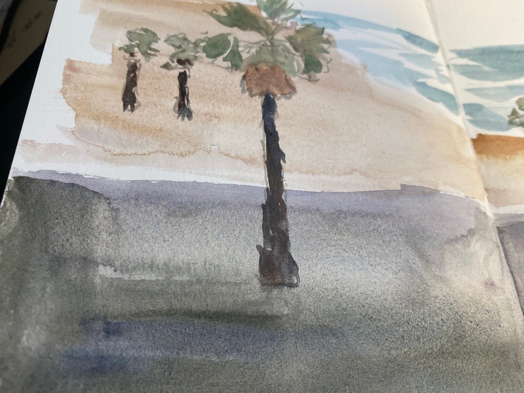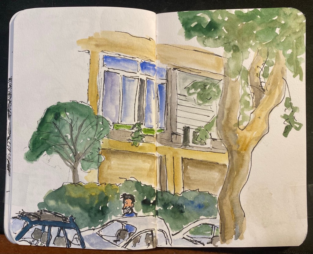 I met with friends for a meal for the first time in a little over a year and it was glorious. We were all vaccinated, and so we could sit down and talk over food and drinks in Tel Aviv that was starting to get back to normal. There are still plenty of signs that Covid is still with us: we were masked at first as was the staff, the first place we chose to go to had closed down and due to the new occupancy rules it was difficult to find a place that could seat us. None of that mattered as we sat down and talked and laughed for hours. I hadn’t realized how much I missed meeting people face to face until I finally had a chance to do so. As I was waiting for everyone to arrive I sat on a bench and drew the first thing that I saw in the dusky evening. In the end I ran out of time and light, but I decided to leave the drawing as is and not fix it at home. A true Urban Sketch that will forever capture the moment for me.
