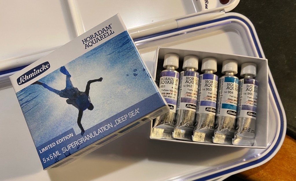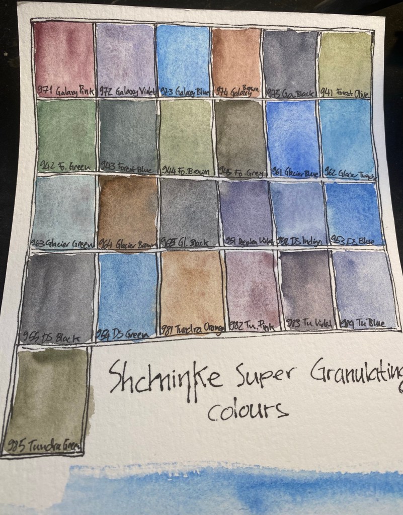 Schmincke recently came out with a new series of limited edition Horadam (artist grade) watercolour paints that are super-granulating.Granulation in watercolour is the an affect that is created when the pigments in the paint separate and settle in a diffused patten on the paper, oftentimes allowing other pigments that they are mixed with to show through. In my everyday watercolour palette Schmincke’s Ultramarine Finest (494) is a prime example of a granulating paint that I use both for its effect as an individual paint and when mixed with various browns and greens. The new 900 limited edition series of Horadam watercolours that Schmincke has issued is composed of 25 paints that are divided into five sets: Galaxy, Glacier, Deep Sea, Forest and Tundra. I decided to purchase all five sets out of curiosity, since limited editions in artist grade watercolours aren’t common, I already use Schmincke almost exclusively, and I’ve been embracing granulation more lately in my work.