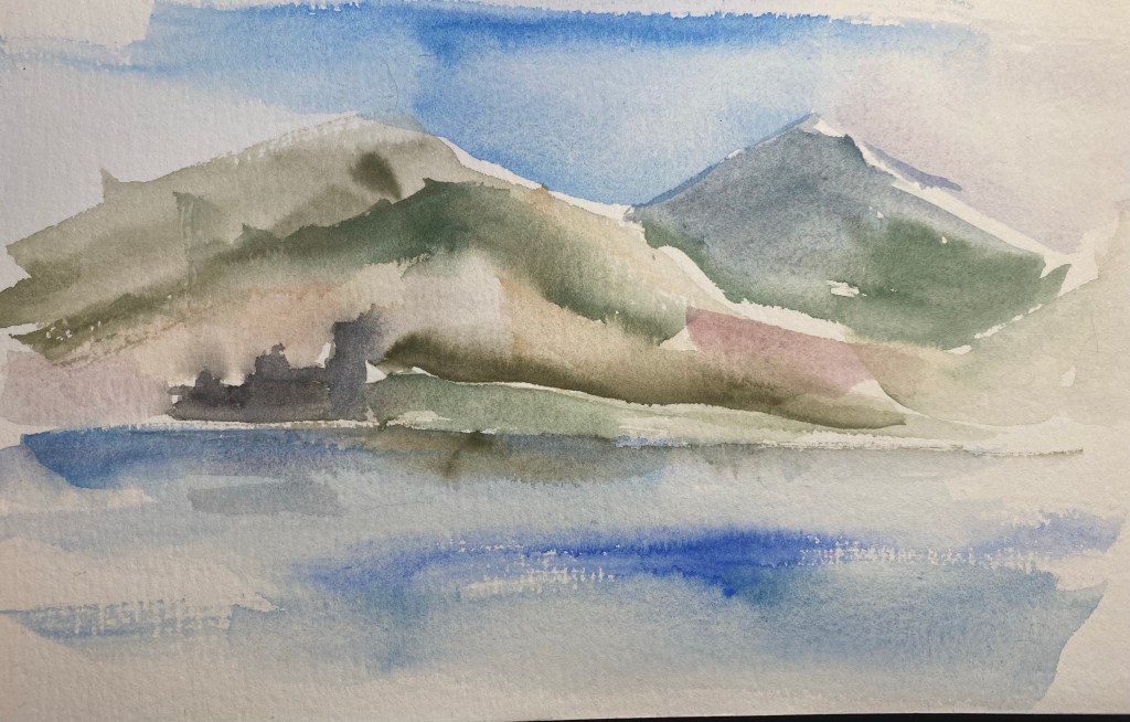 In early January we had a bout of very foggy days and I took photos of various city scenes in the lockdown and the fog thinking that I’d later draw them. I thought that drawing fog in watercolour would be pretty straightforward, because what is easier than just drawing wet on wet and letting the watercolour do its thing? But after looking more closely at the photos I realized that fog isn’t just grey sky melting into the landscape, it’s also a muting of colours, a flattening of the landscape, the lack of shadow. In the end I drew two small landscapes, one urban and one of the park, and although they were challenging I enjoyed drawing them enough to want to have the same experience with the text. The grey writing in Hebrew in the bottom right corner is a line out of a well known rock song that embodies a lot of the spirit of Tel Aviv. It was written using Diamine Silver Fox on a semi-wet background, to facilitate ink spread.