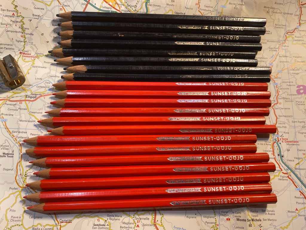 The real find for me were some very old Jerusalem Pencils (based on the logo), in this case coloured pencils (black and red). These are very waxy with relatively little pigment, but I don’t intend to draw with them anyway, and it just tickles me that didn’t translate “sunset” to “שקיעה” (or sunset in Hebrew) but rather chose to transliterate it, to give the pencil a more cosmopolitan feel.