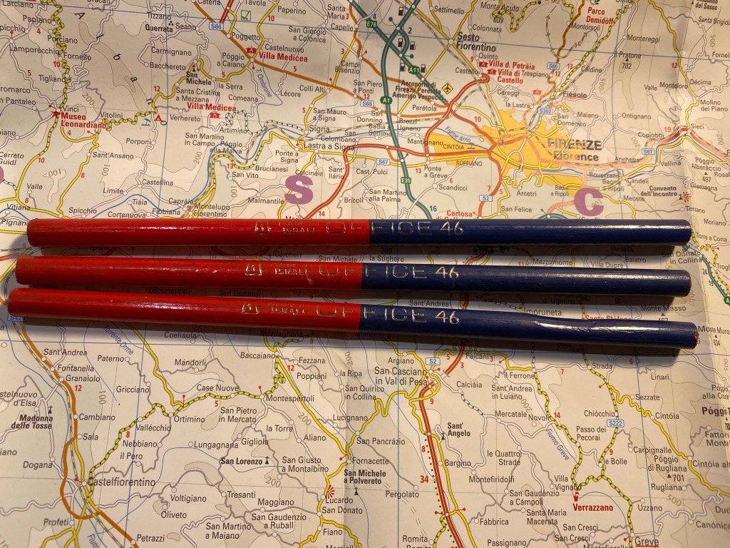 Even rarer for me are these Jerusalem Pencils Office 46 red and blue dual pencils. One of them is badly warped and another is slightly warped, but they still have their handsome imprint with an art deco-y font.