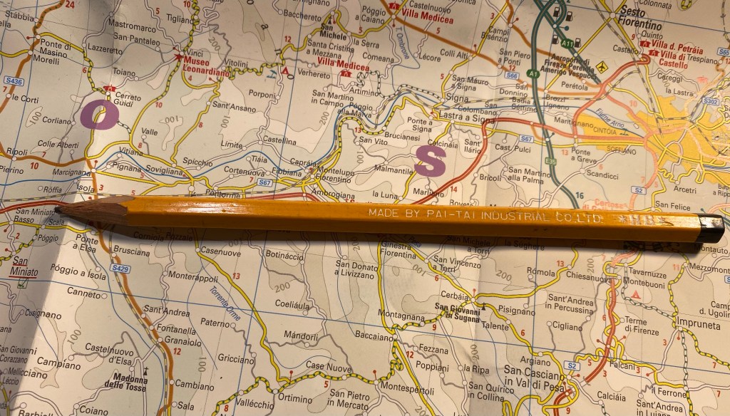 Here’s a pencil that I’m pretty sure was made by Jerusalem Pencils, but there’s no telling it if was under that name or Pan Art. It was sharpened at both ends so you can just make out that it’s an HB pencil, and enough of the imprint is left to know that it was made in Israel and is called Oriole.