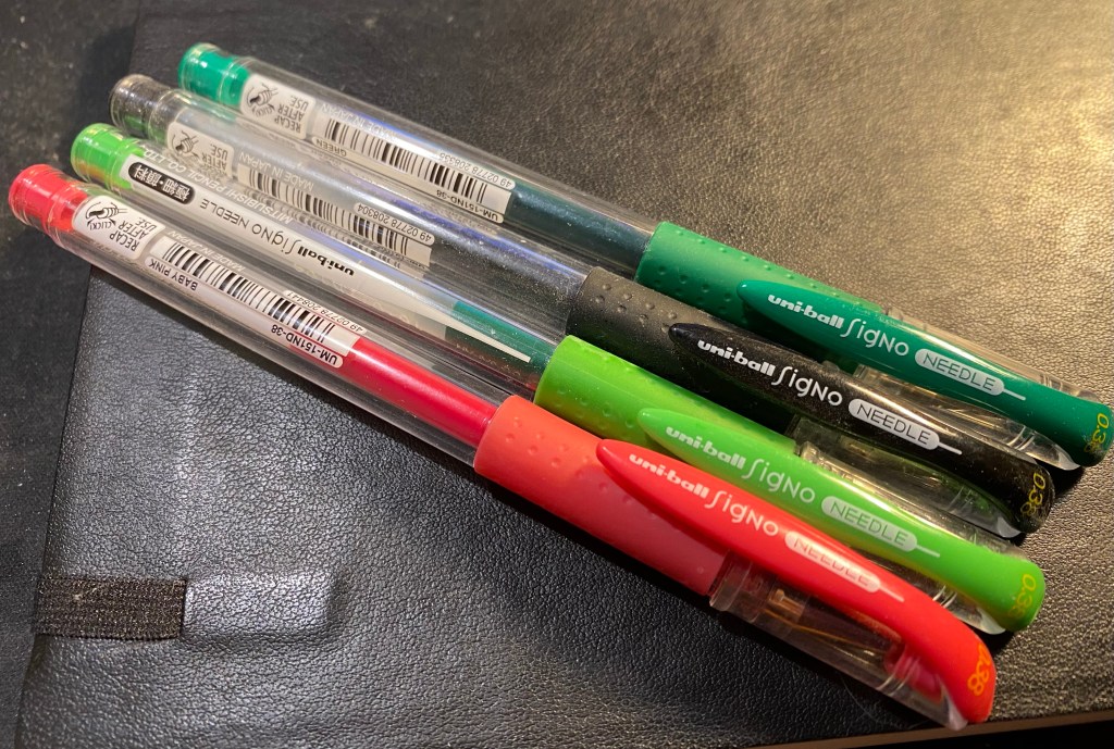 I am a huge fan of the Uni-ball Signo line, and the Signo RT 0.5 is my favourite gel pen body and my favourite gel ink refill (UMR-85N). In second place is the Uni-ball Signo DX (UMR-1 refill) and its less common brother: the Uni-ball Signo Needle, which is basically a Signo DX with a needle tip instead of a cone tip.