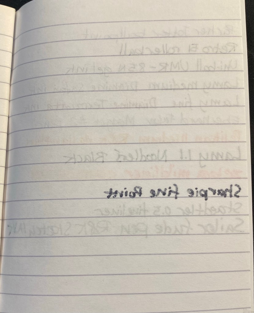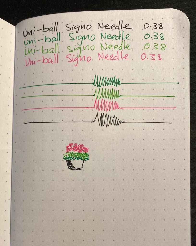 Here’s a writing sample with the Signo Needle 0.38. As you can see the lines are crisp and consistent even though I’ve had some of these pens lying around my desk for years. They are a tiny bit wider than the Hi-Tech-C 0.38 lines (just as the Signo DX 0.38 lines are wider than the Hi-Tech-C but thinner than the Pilot G2 0.38).