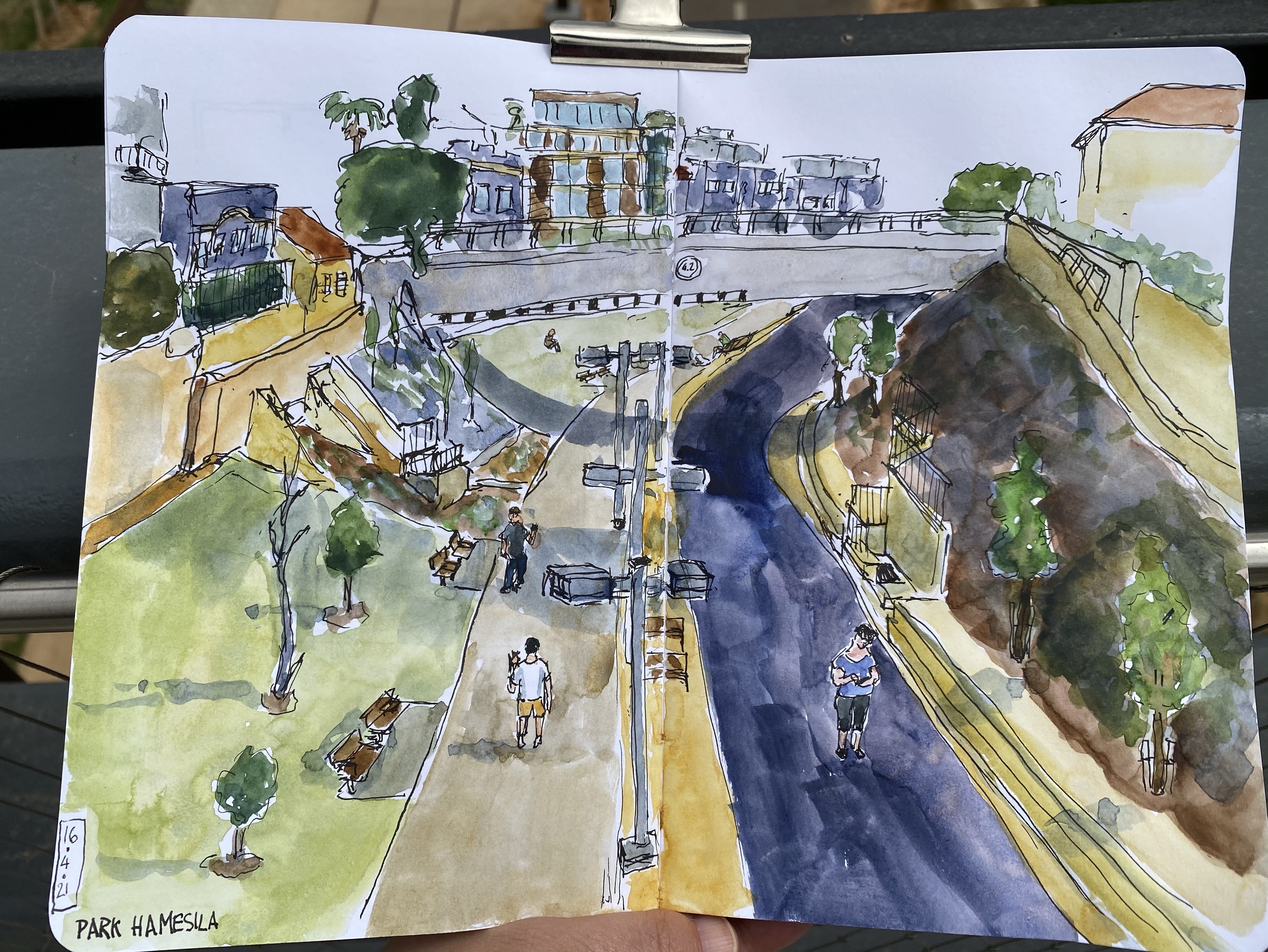 My first Urban Sketchers Sketchcrawl of the year (there was one earlier, in March, but my mom was hospitalized, so I couldn’t make it) to the brand new Park HaMesila in the beautiful Neve Zedek neighbourhood. A dump and parking lot have been transformed into a park that will lead all the way to the Tachana complex once it’s complete. At the moment it offers a very little shade and not much greenery, but you can see the potential, and you can definitely see how much people are loving it.
