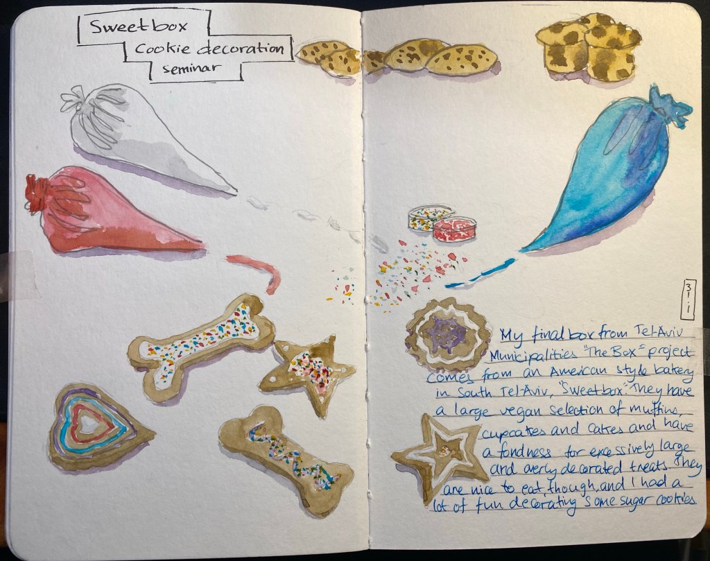 Catching up on some more sketchbook pages from my Sketchbook Design course as I’m working on giving my palette the largest overhaul it’s had since I started painting with watercolours. This page was inspired by the final box I got from the Tel Aviv muncipality’s “The Box” project, created to support local businesses during the lockdown.