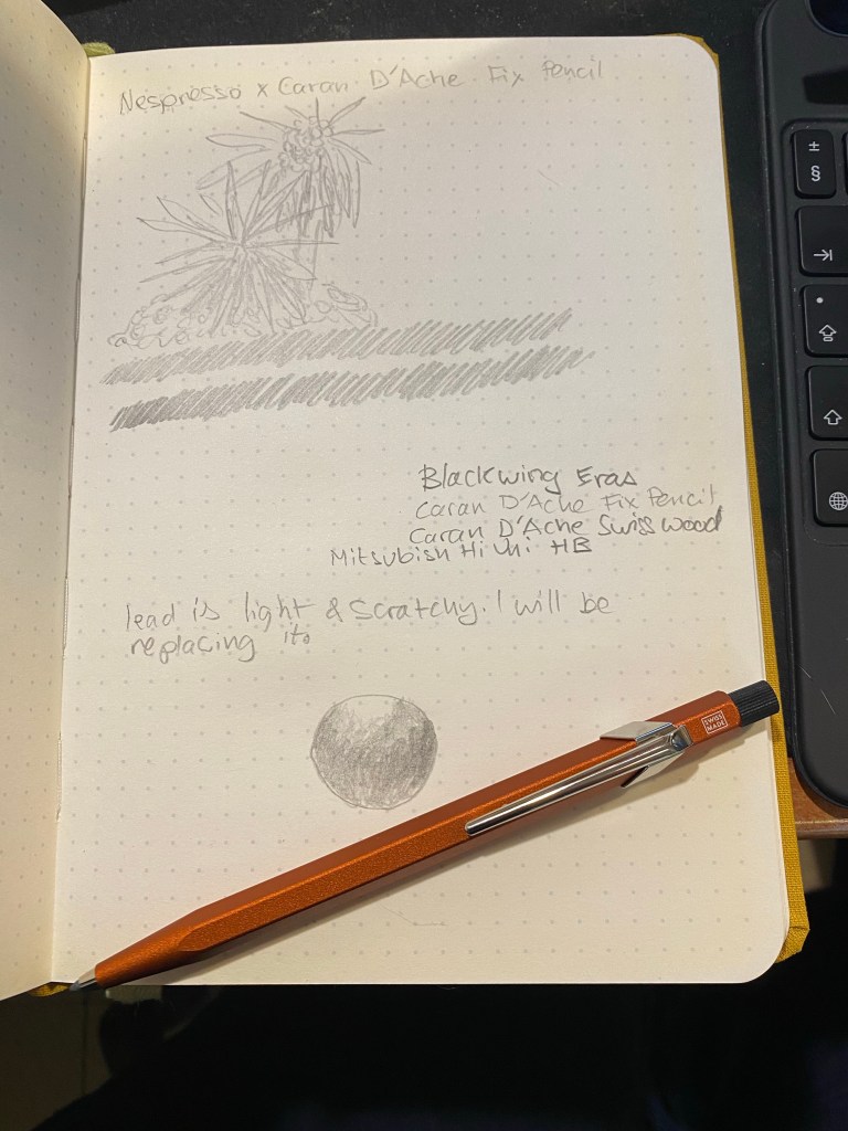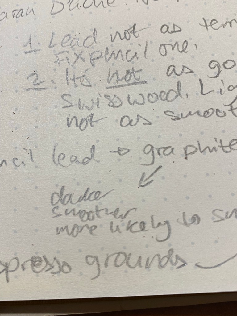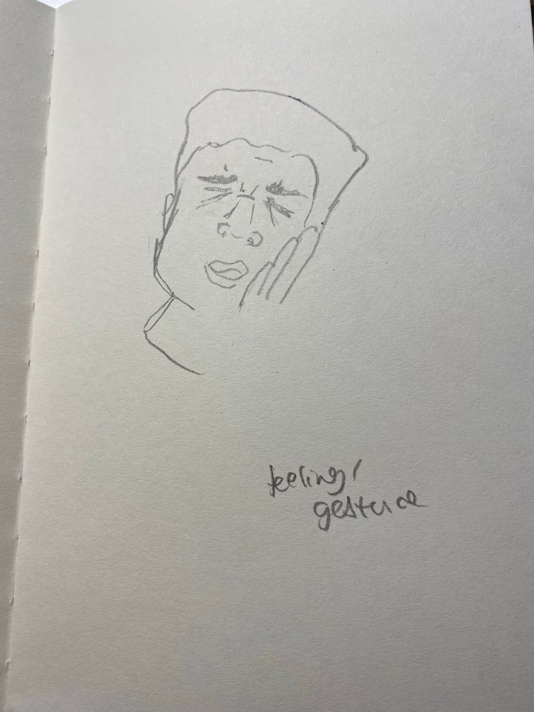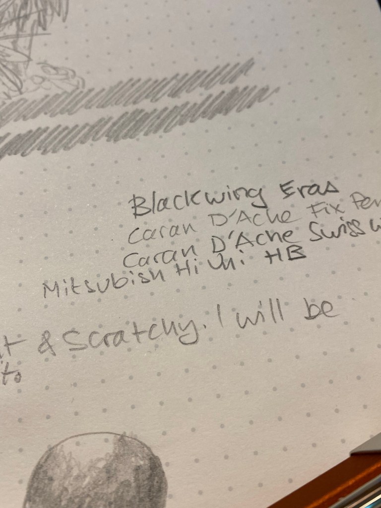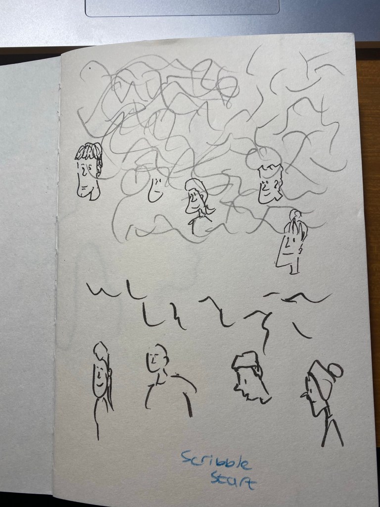 We started with the suggestion to just doodle while we waited for people to join. I was using a new sketchbook that was very cheap, laid flat and had thick textured paper (good for pencil). I used a Caran d’Ache Fixpencil with a 2B lead, and a Tombow brush pen throughout this one hour session.