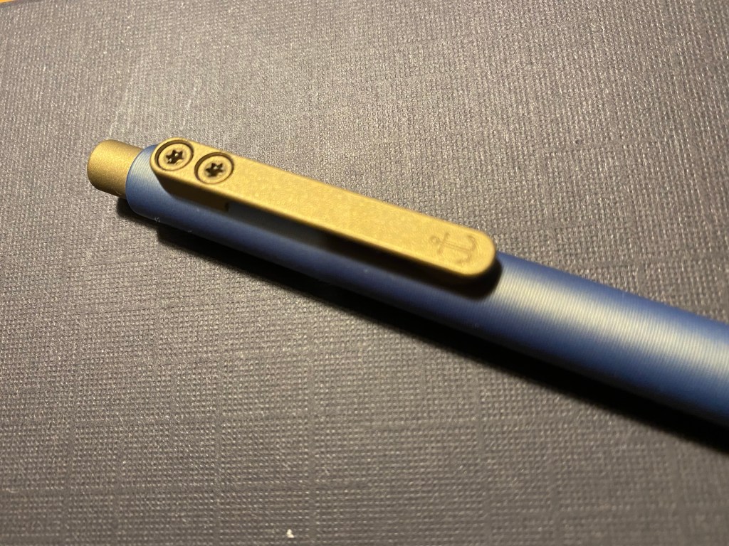 The clip has a gold Cerakote finish that evokes the golden undertones of the blue metallic Cerakote finish on the pen body. The gold is muted, and helps make the pen classy not flashy 🙂