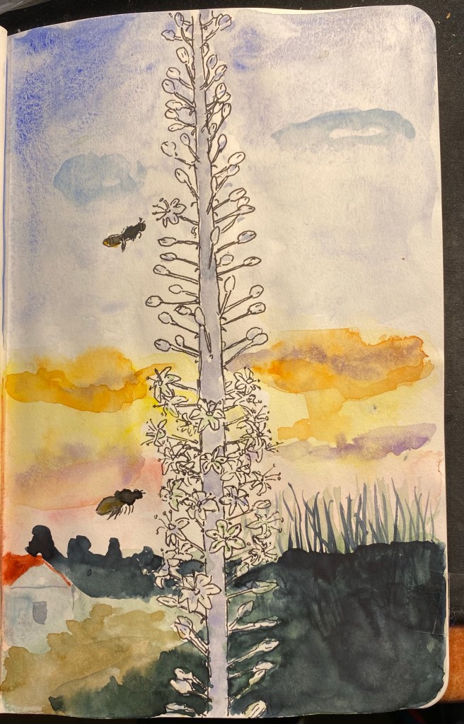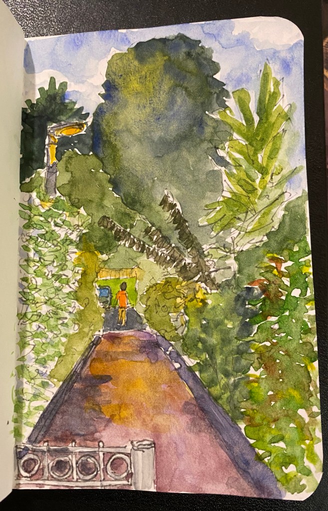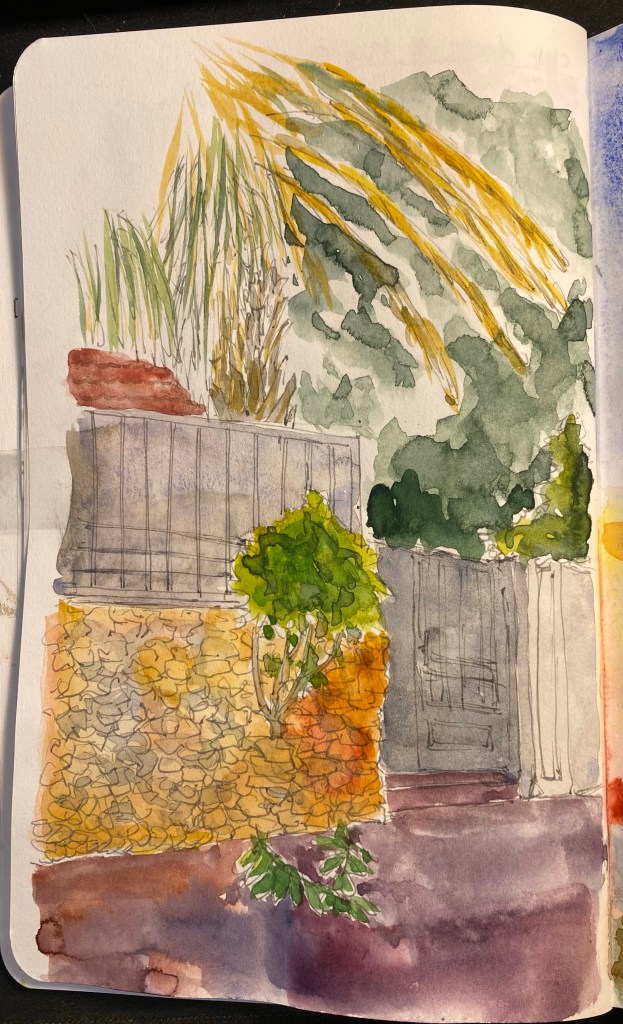I’m playing with green watercolour mixtures and drawing better foliage, so I took the opportunity to make this quick line sketch during one of my walks. I worked on the watercolours later, and I’m pretty happy with the results.