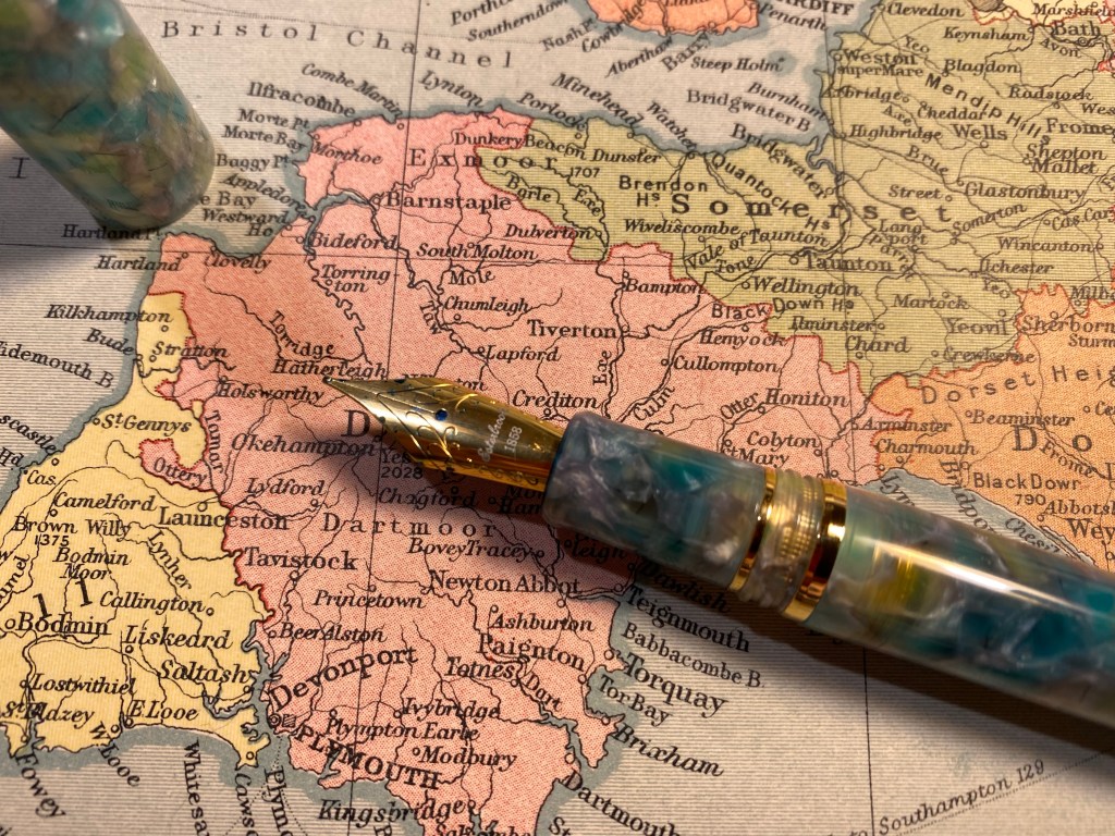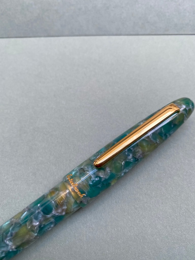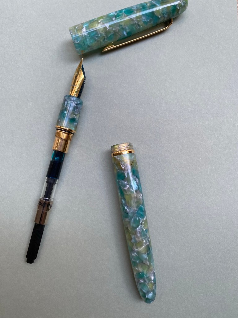 First of all, the pen is gorgeous. It has the classic cigar/torpedo shape that many fountain pens share, but the material of the Sea Glass pen sets it apart. It’s partly translucent, partly chatoyant, and vibrant without being Benu loud.