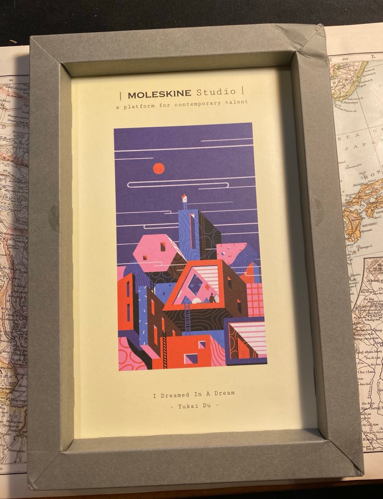 The flip side of the frame. You can see that there are holes for hanging the frame, as well as information about the paper in the notebook (gasp!). I wish Moleskine would print this info on every notebook they sell.