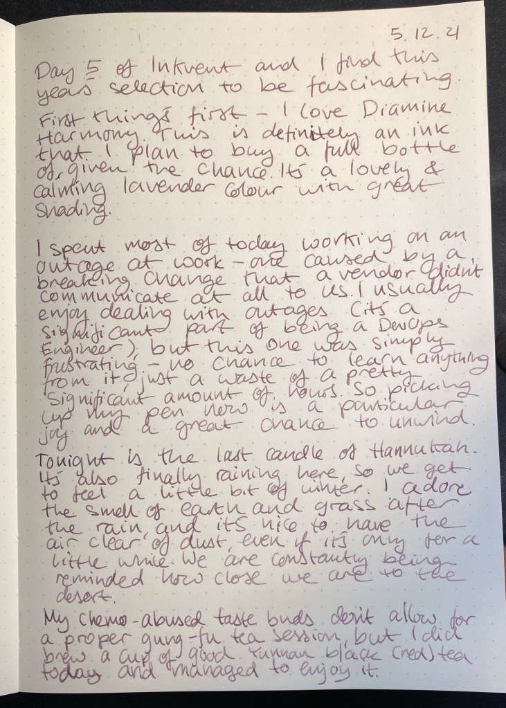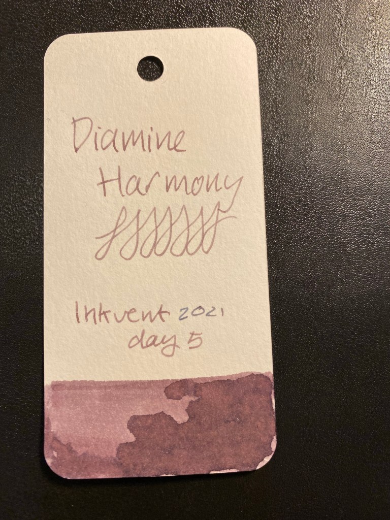 Day 5’s ink is Diamine Harmony, a standard ink in lavender (i.e. light, slightly pinkish-grey purple). As with all the Inkvent inks so far it’s far from what I’d expect to find in this calendar, and it’s elusive to photograph.