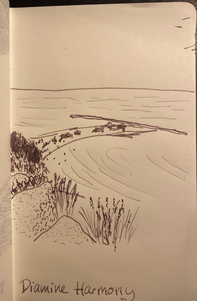 I drew the view of the Mediterranean from one of my morning walks to test this ink out. The photo doesn’t do this ink justice – it’s a more vibrant and less grey than it appears here. Diamine Harmony shades beautifully even in a fine nibbed pen. It’s a shade lighter than Diamine Seize the Night, and it doesn’t have the shimmer or the sheen of that ink, which makes it distinct enough from the other purple Inkvent calendar ink.