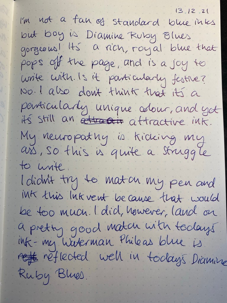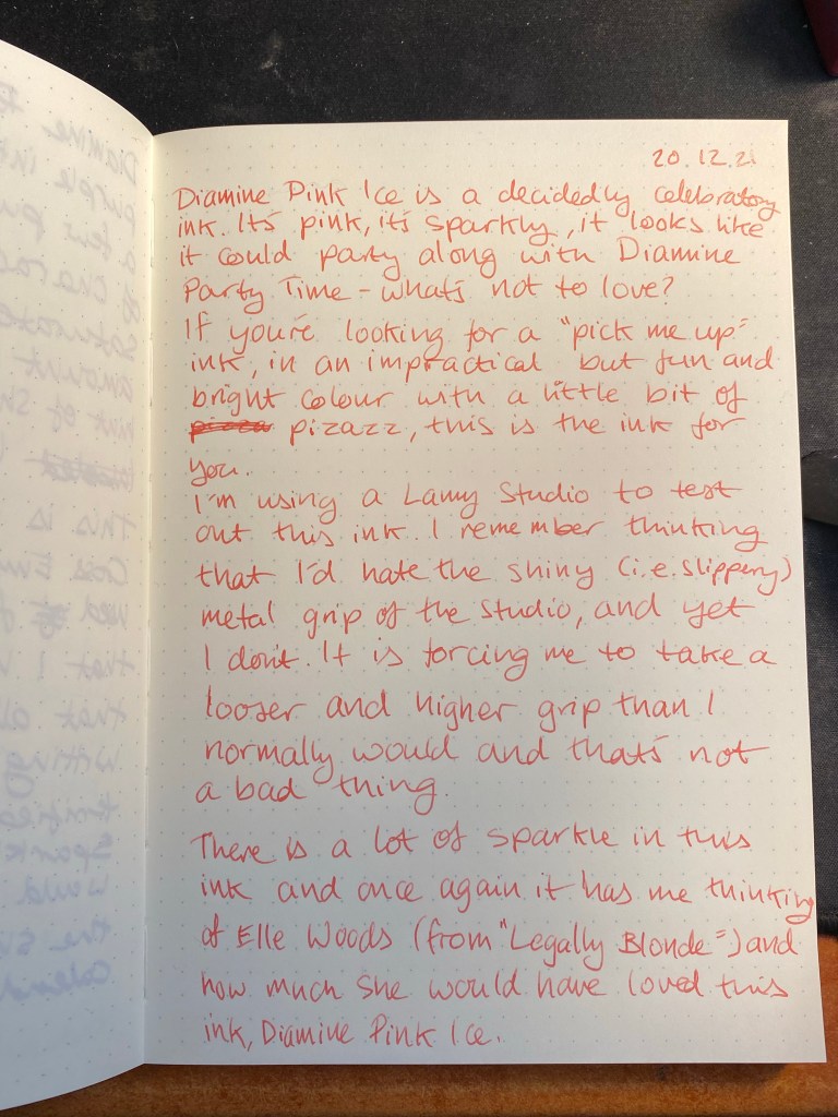Day 20’s ink is Diamine Pink Ice, and it’s a bright pink ink with pink sparkles – as Elle Woods as an ink can get.