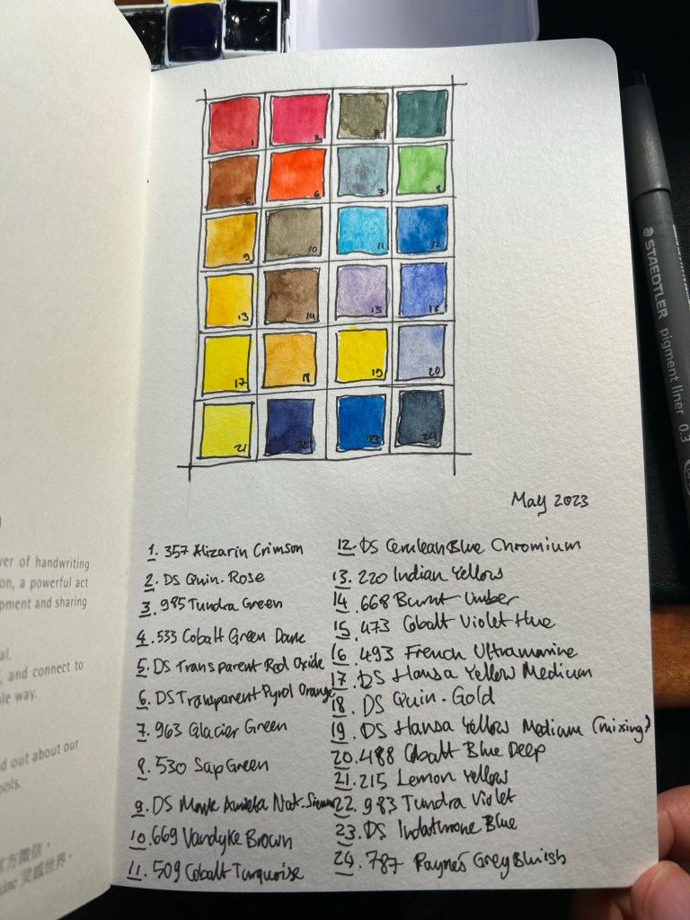 Of the 23 paints, 15 are Schmincke Horadam and the rest are Daniel Smith. I’m pointing this out so that you feel comfortable mixing between paint manufacturers on your palette. This can be done so long as you are using the same grade of paint in each maker (artist grade, for example).