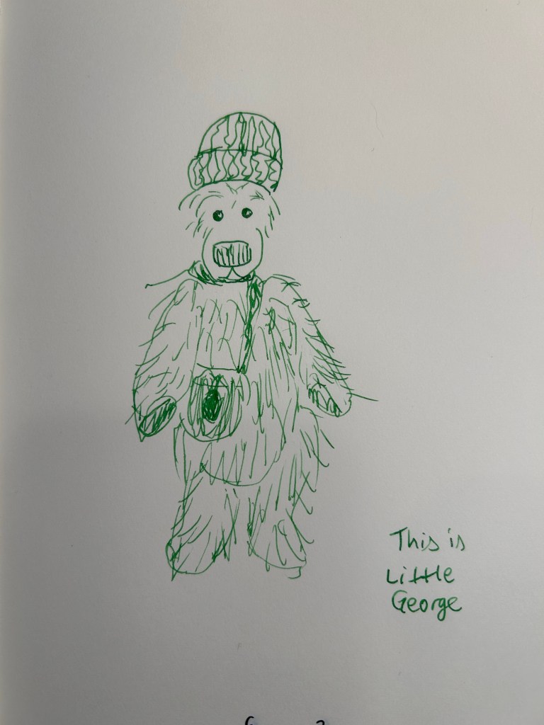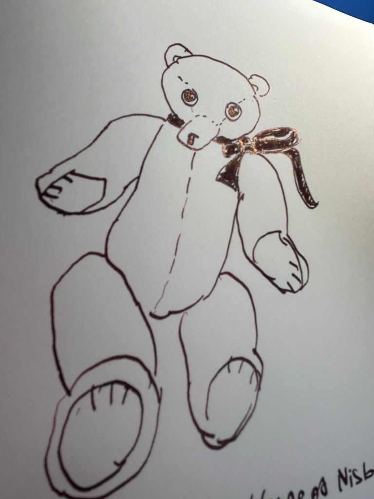 Here’s a sketch of the totally mis-named Spooky bear. He’s anything but spooky. You can see just how much shading Diamine Lavender Frost has, and the shimmer effect in action especially on the bear’s nose: