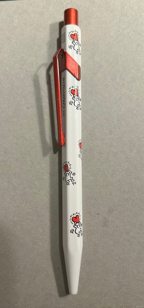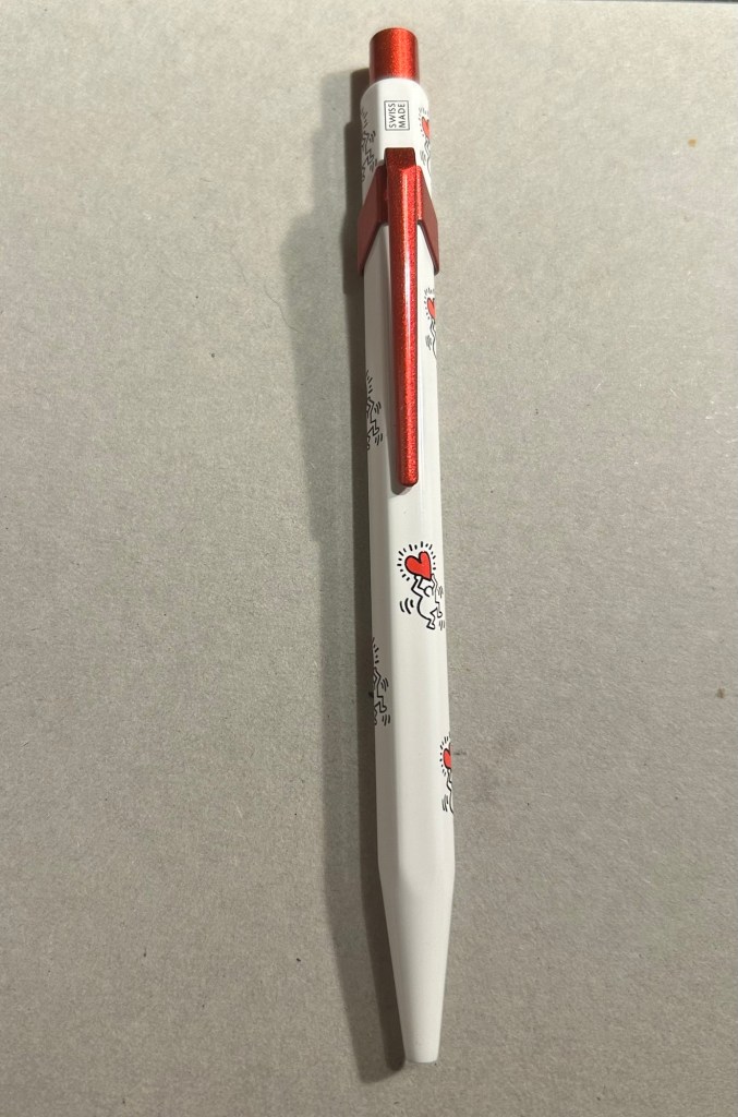 The pen itself is white, with a sparkly red knock and clip. The paint on these feels like lacquer, and the look is sleek and bold. There are dancing people holding red hearts all over the pen (so you get some Keith Haring artwork, but it’s not overcrowding the pen), and the pen body’s finish is the standard 849 glossy finish.