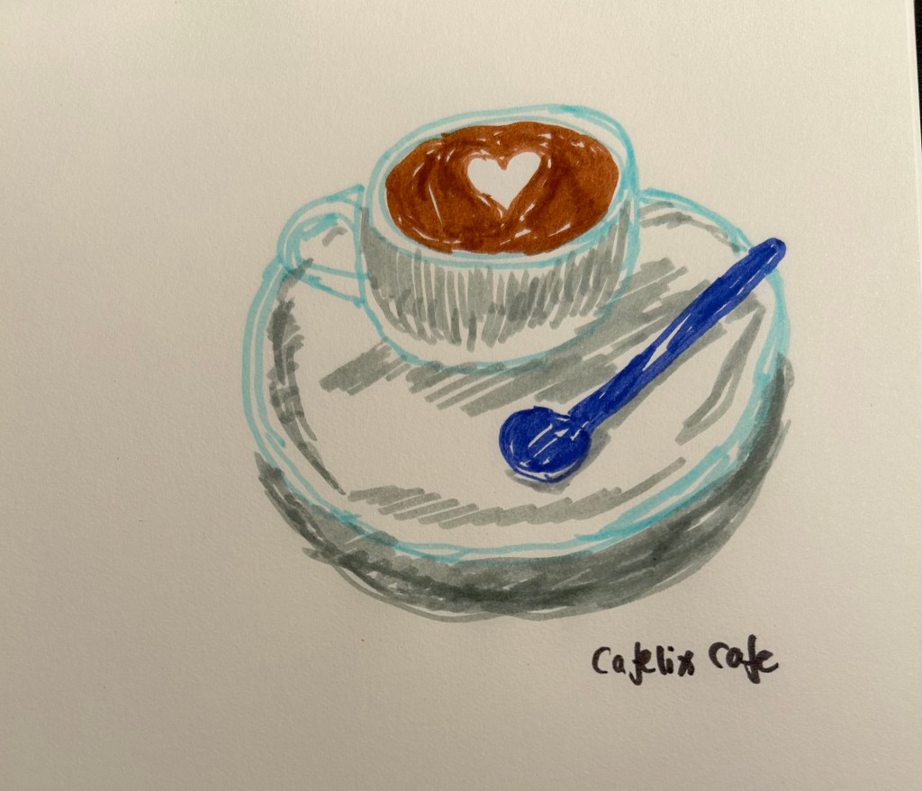 I got a set of Bic Kids markers and decided to sketch today’s coffee with them. You don’t need expensive drawing supplies to draw, and not every sketch needs yo be perfect.